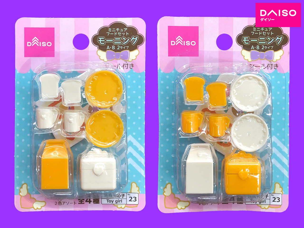 ■ダイソー(2020〜) 再販されたダイソーのミニチュア玩具。 フードセットには、モーニング、ティータイム、クッキングの4種類、それぞれカラー違いとバリエーションで4種類ずつある。 (中国製)
