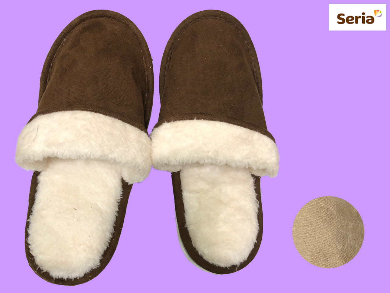 セリア(2020〜) セリアオリジナル、スエード地の冬用スリッパ。ブラウンとベージュの2色。 サイズ:26cm (中国製)
