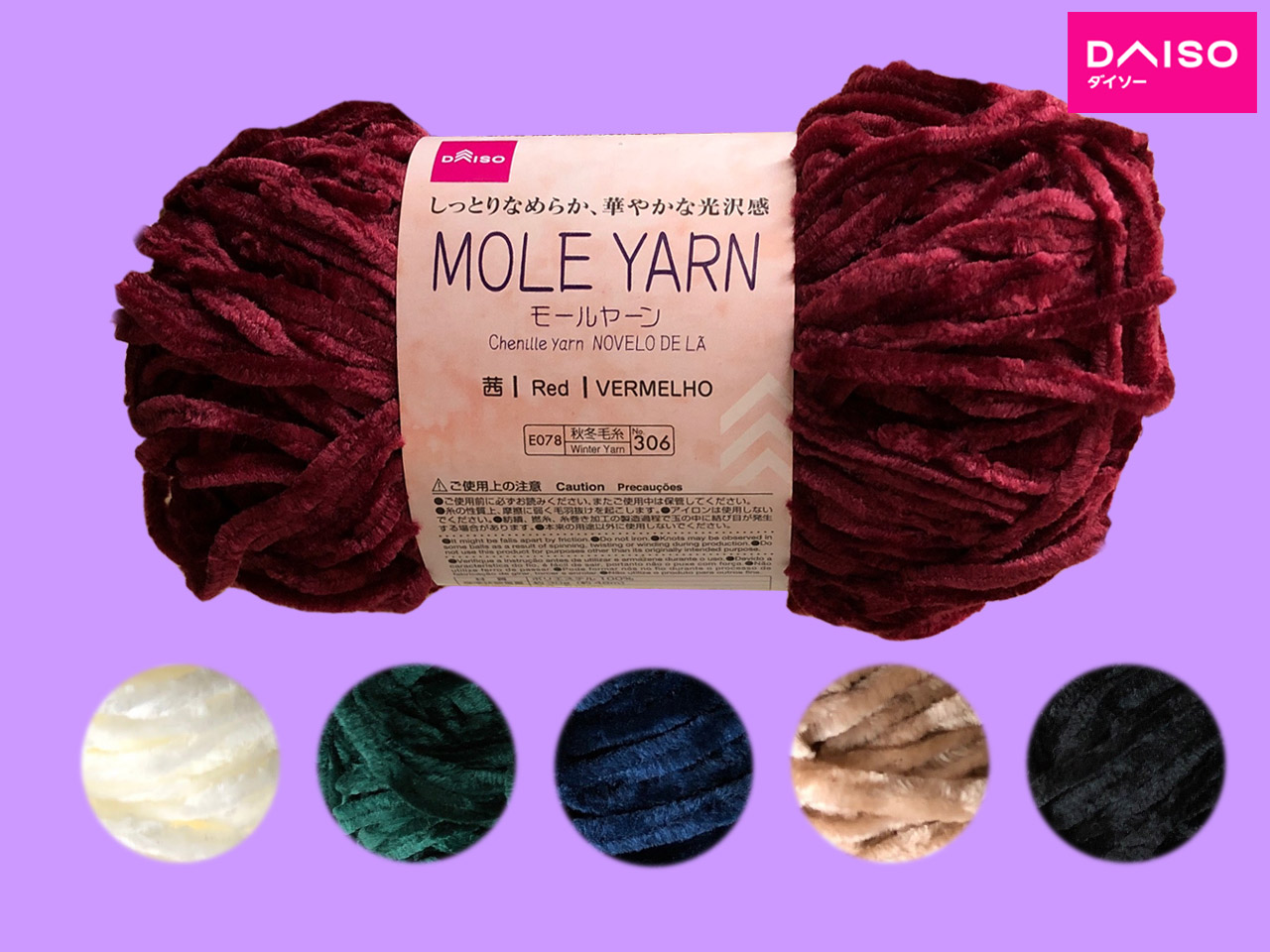 ■ダイソー(2019〜) 名前通り、ビロードのような光沢と触り心地のヤーン。 ポリエステル100%、30g(糸長約48m) <編み針の目安> 4.0mm〜5.0mm 棒針:8号 かぎ針:8号 <標準ゲージ> 16目24段(10cm平方メリヤス編み) カラーは(2020年1月現在)、①白、②緑、③茜、④藍、⑤薄茶、⑥黒の6色