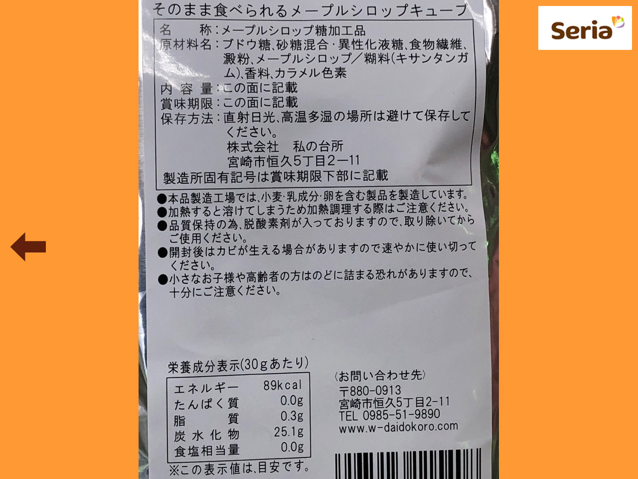 ■セリア(2020〜) セリアがシリーズ展開している製菓用材料にラインナップされた「そのまま食べられる」シリーズから、メープルシロップキューブ。 製菓材料としてはもちろん、文字どおりそのまま食べられる。 内容量:30g (株)私の台所 製