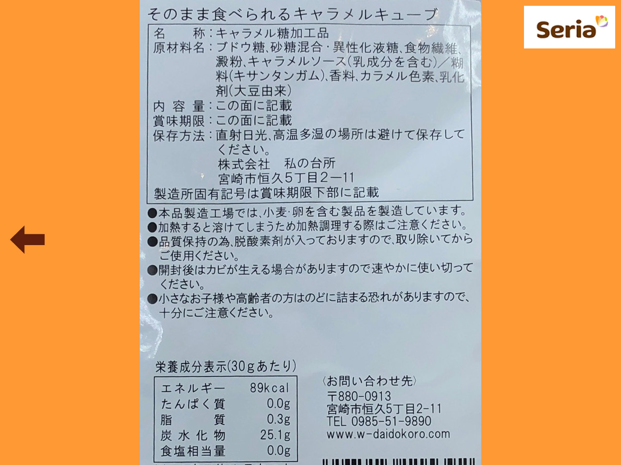 ■セリア(2020〜) セリアがシリーズ展開している製菓用材料にラインナップされた「そのまま食べられる」シリーズから、キャラメルキューブ。 製菓材料としてはもちろん、文字どおりそのまま食べられる。 内容量:30g (株)私の台所 製