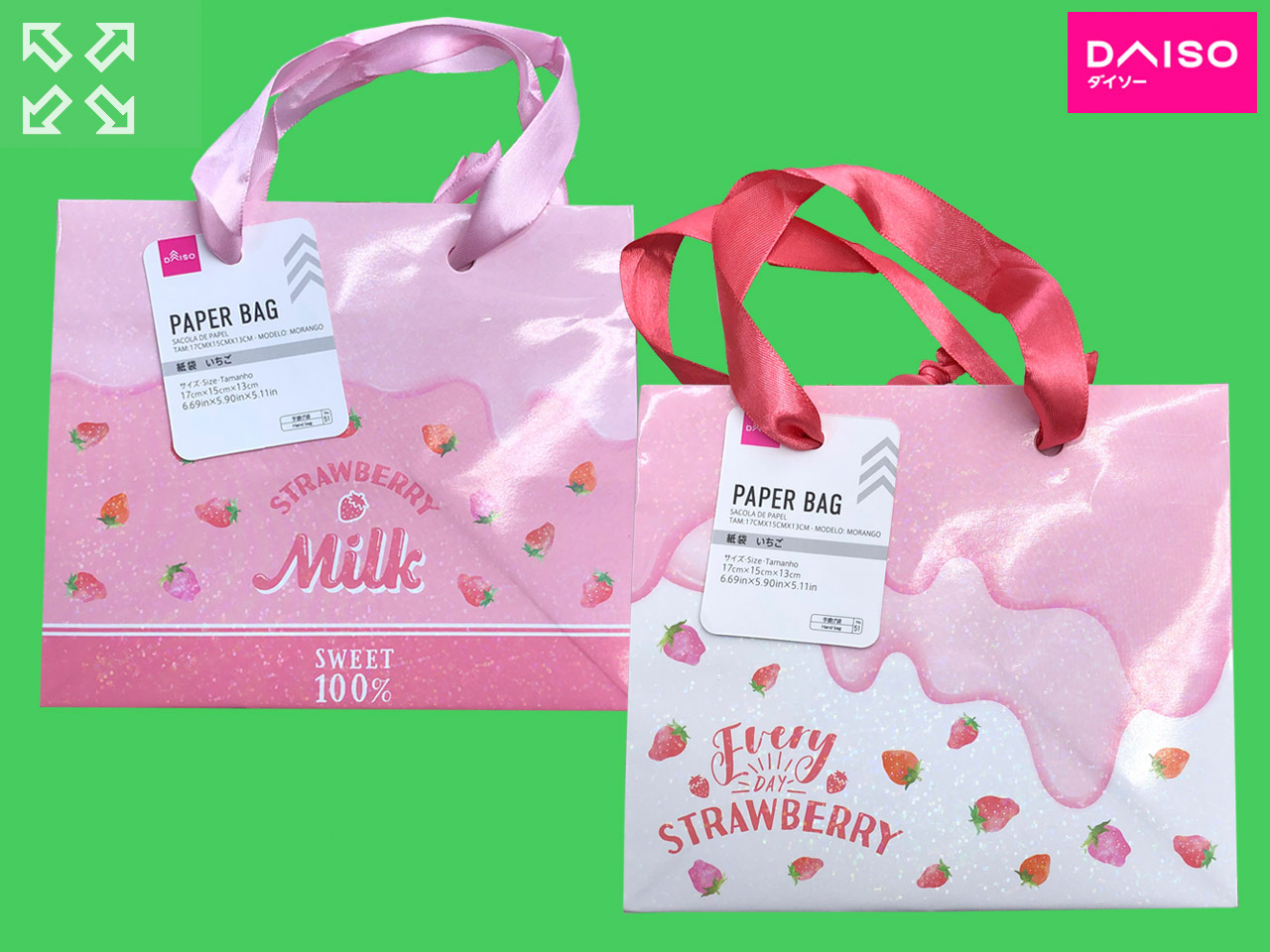 ダイソー(2021〜) ギフト包装用の手提げ紙袋。 サイズ:17cm × 15cm × マチ13cm (中国製)