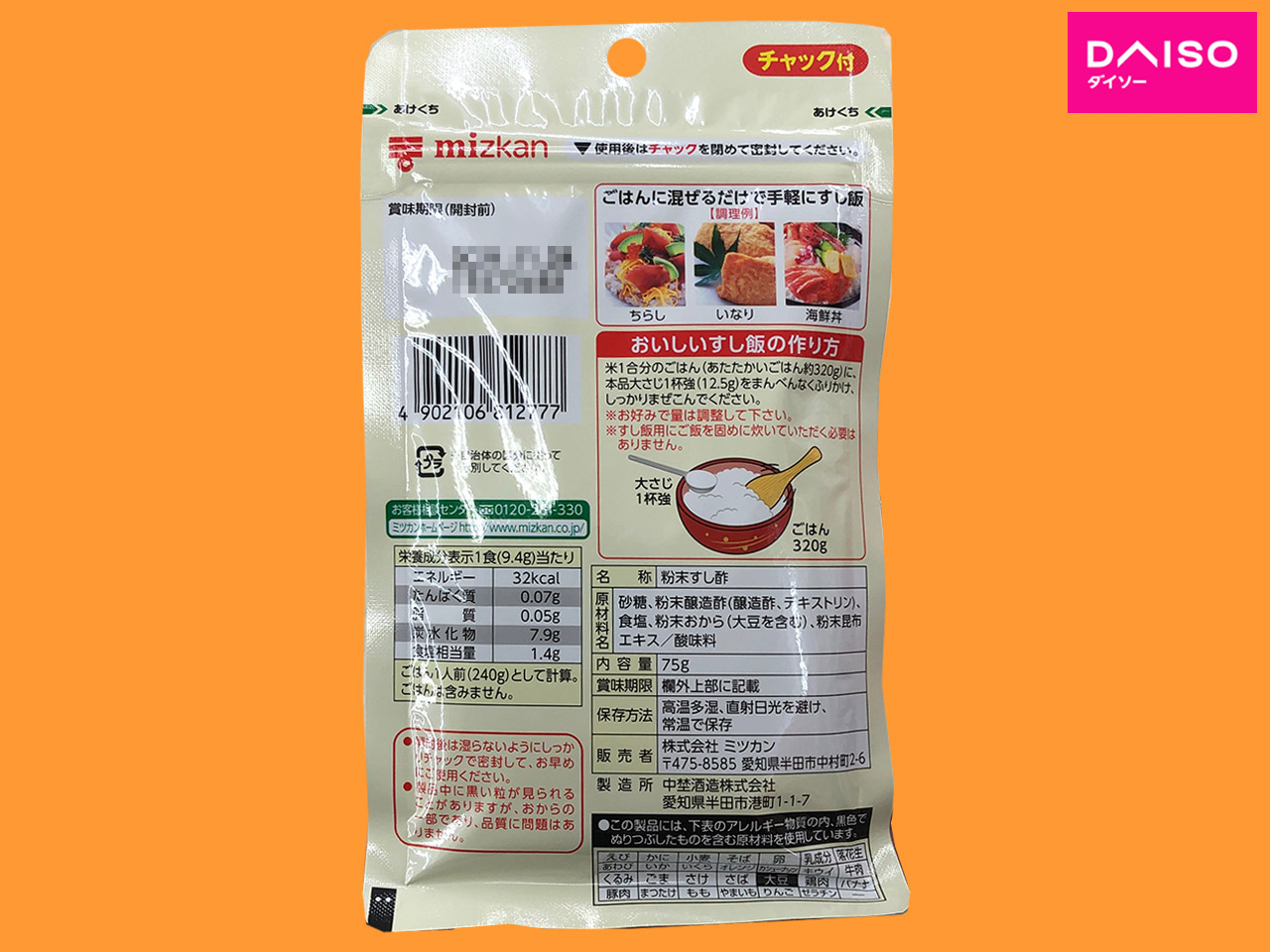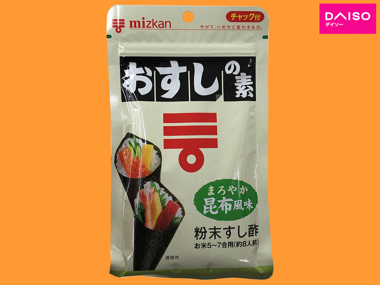 ■ダイソー 粉末のすし酢。 1合分のごはんに大さじ1杯強をふりかけてまぜると簡単にすし飯がつくれる。 内容量:75g ミツカン社製 ☞メーカーHP