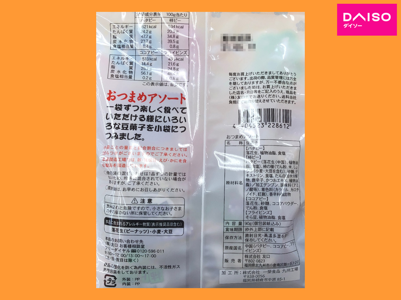 ダイソー (株)友口製、豆菓子のミックス。 4種の個別小袋包装タイプ。 原料は中国産。 ・バタピー ・柿ピー ・ココアピー ・フライビンズ の4種 内容量:90g