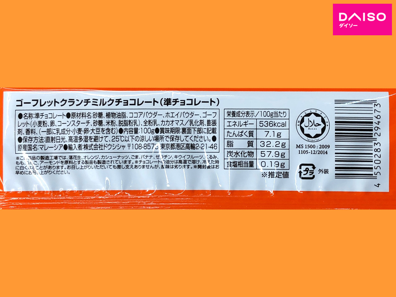 ダイソーの製菓材料と同じドウシシャの商品で、製菓材料として取り扱いされているクランチ入りチョコレート。