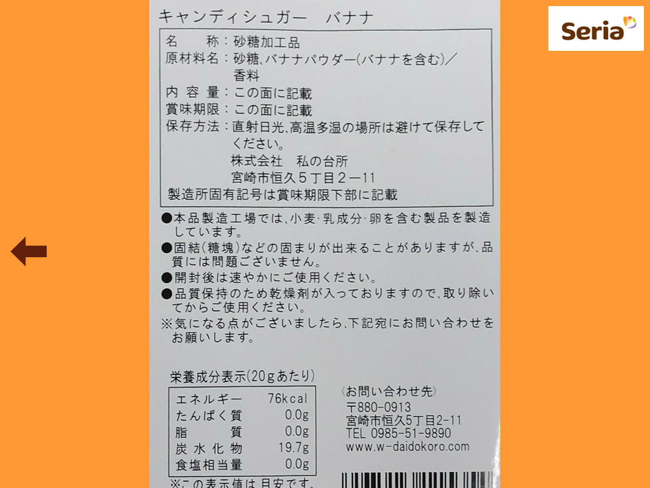 ■セリア(2020〜) 砂糖の代わりに用いるだけで、バナナ風味になる。 内容量:20g(※2021年2月現在)