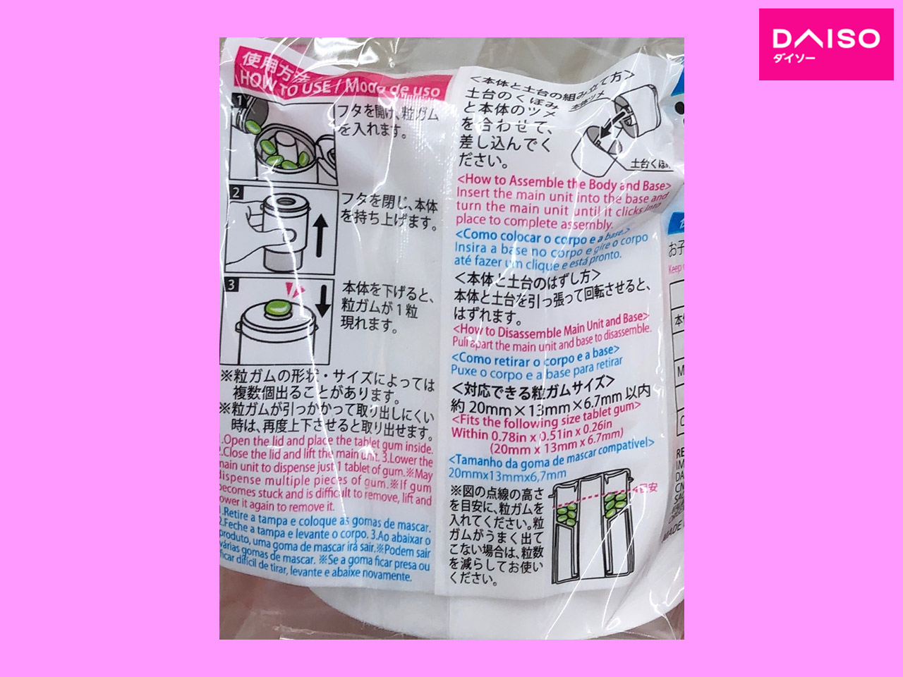 ■ダイソー(2021〜) 粒型のガム専用ケース。 ケースの外側を上下させると、本体上部に粒ガムが一粒現れる。 対応ガムサイズ:20mm×13mm×6.7mm以内