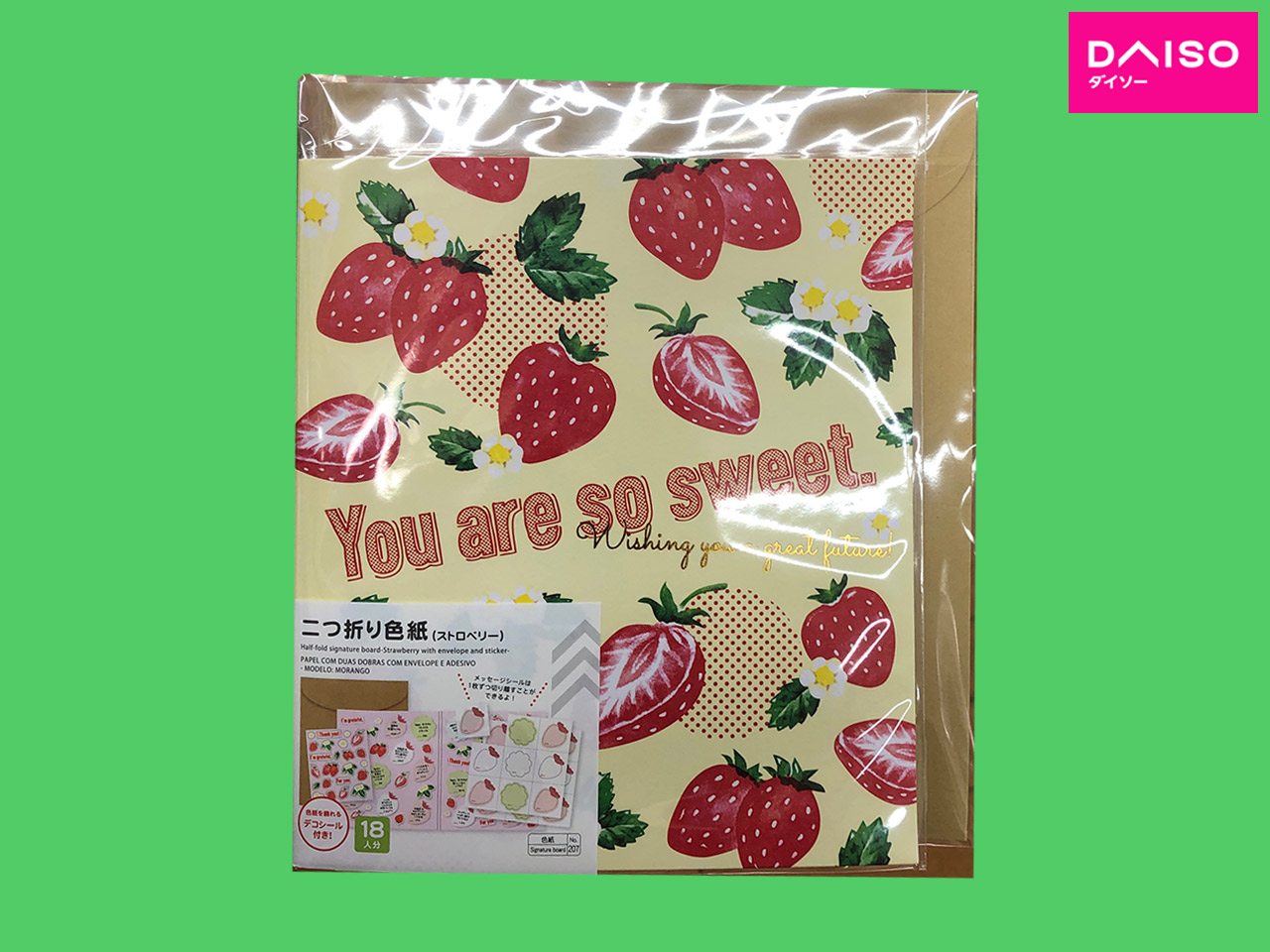 ■ダイソー(2021〜) 二つ折り型の色紙。「ストロベリー」 色紙を入れる封筒付き。 個別に切り離せるメッセージシール18人分と余白などを飾るテコシール付属。 サイズ:色紙 17.6cm×20cm 封筒 19.1cm×24cm デコシール 11cm×12.5cm(23片) メッセージシール 16.4cm×16.5cm (中国製)