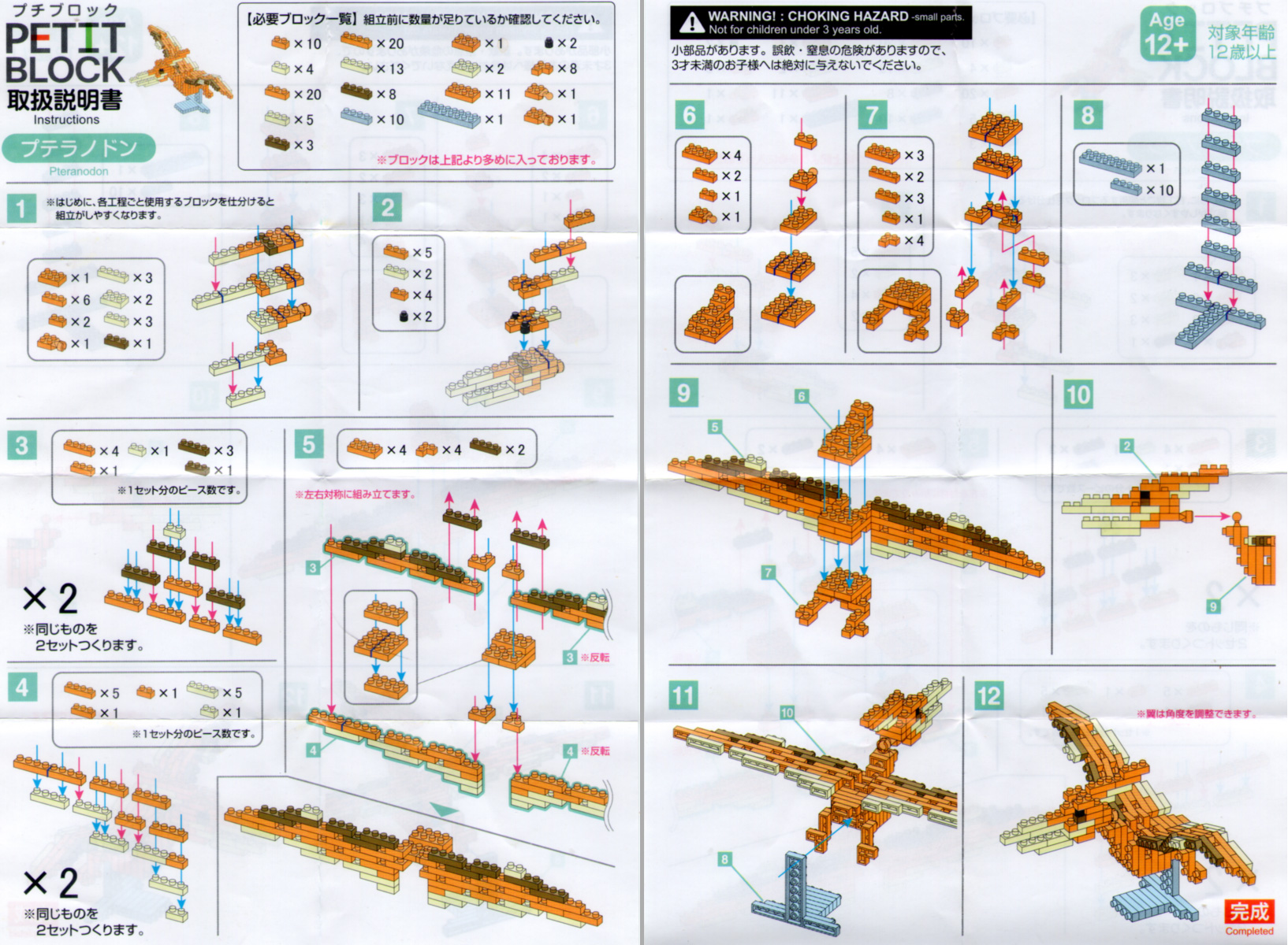 ■ダイソー ダイソーのトイブロック『プチブロック』の『恐竜のなかま』シリーズから。プテラノドン。 画像2の設計図は、拡大できます。 (※拡大操作は、画像の上ではなくテキストのところで行ってください)
