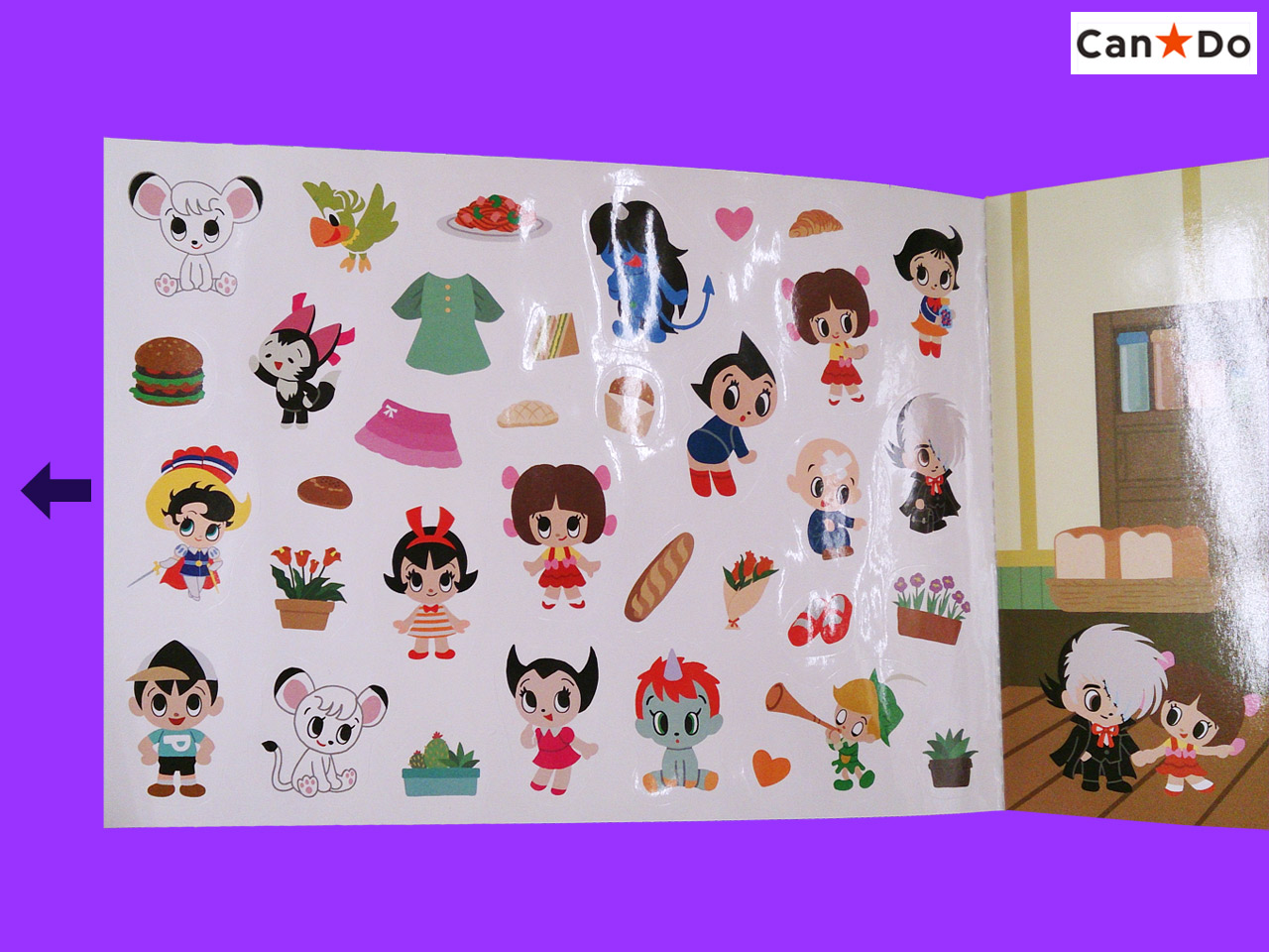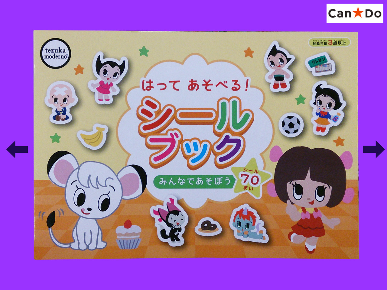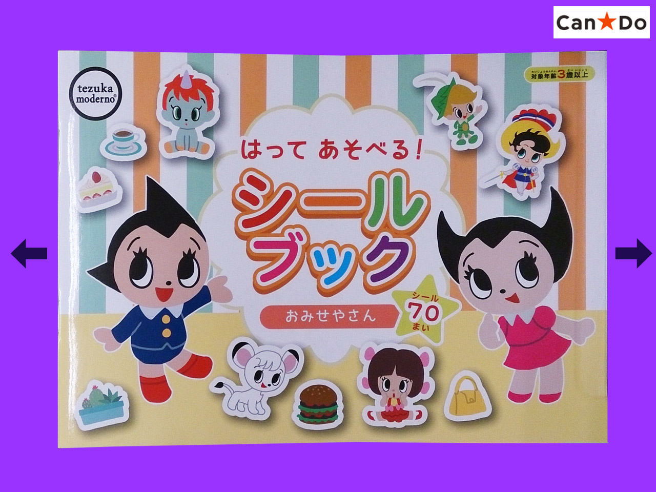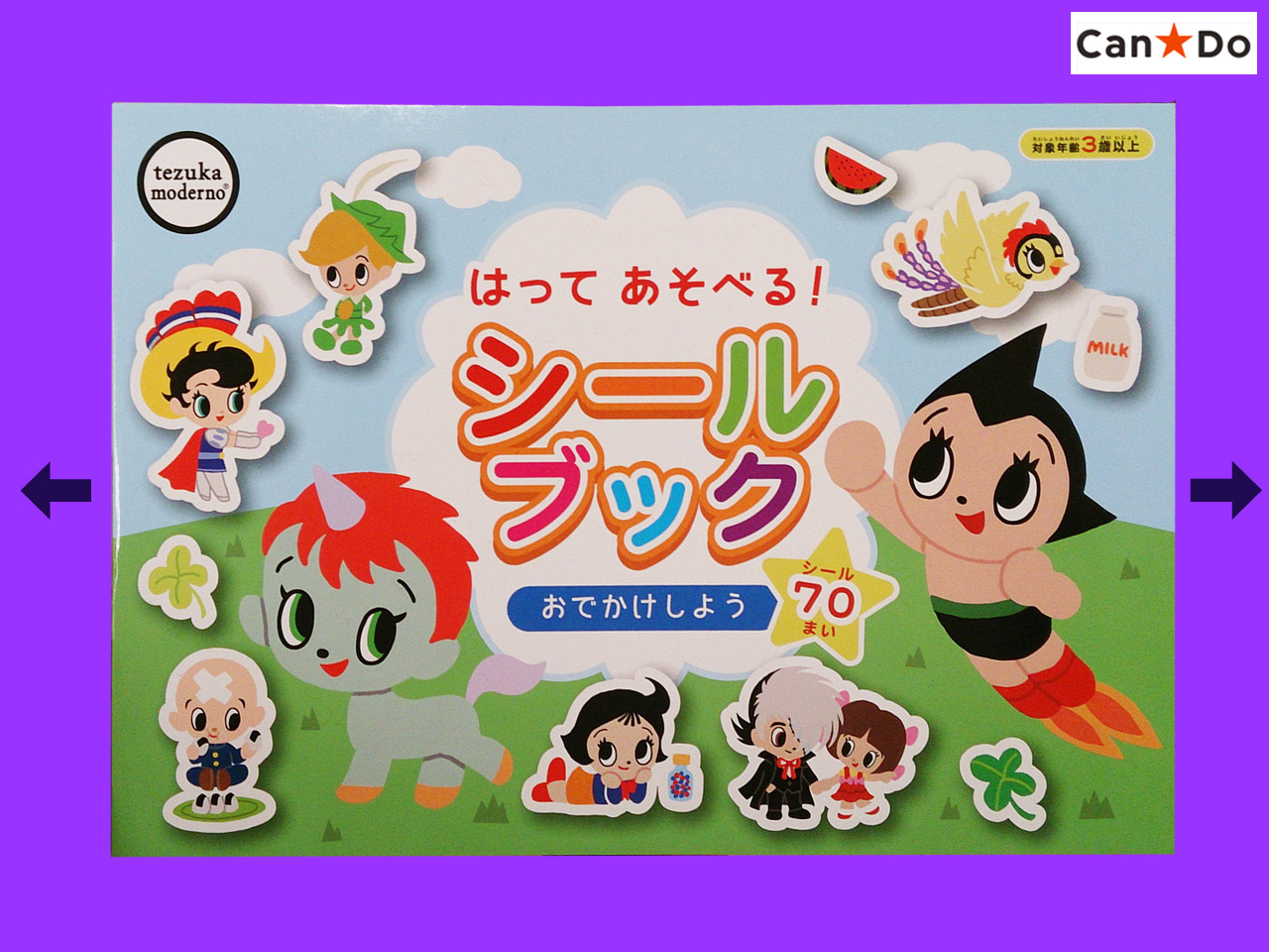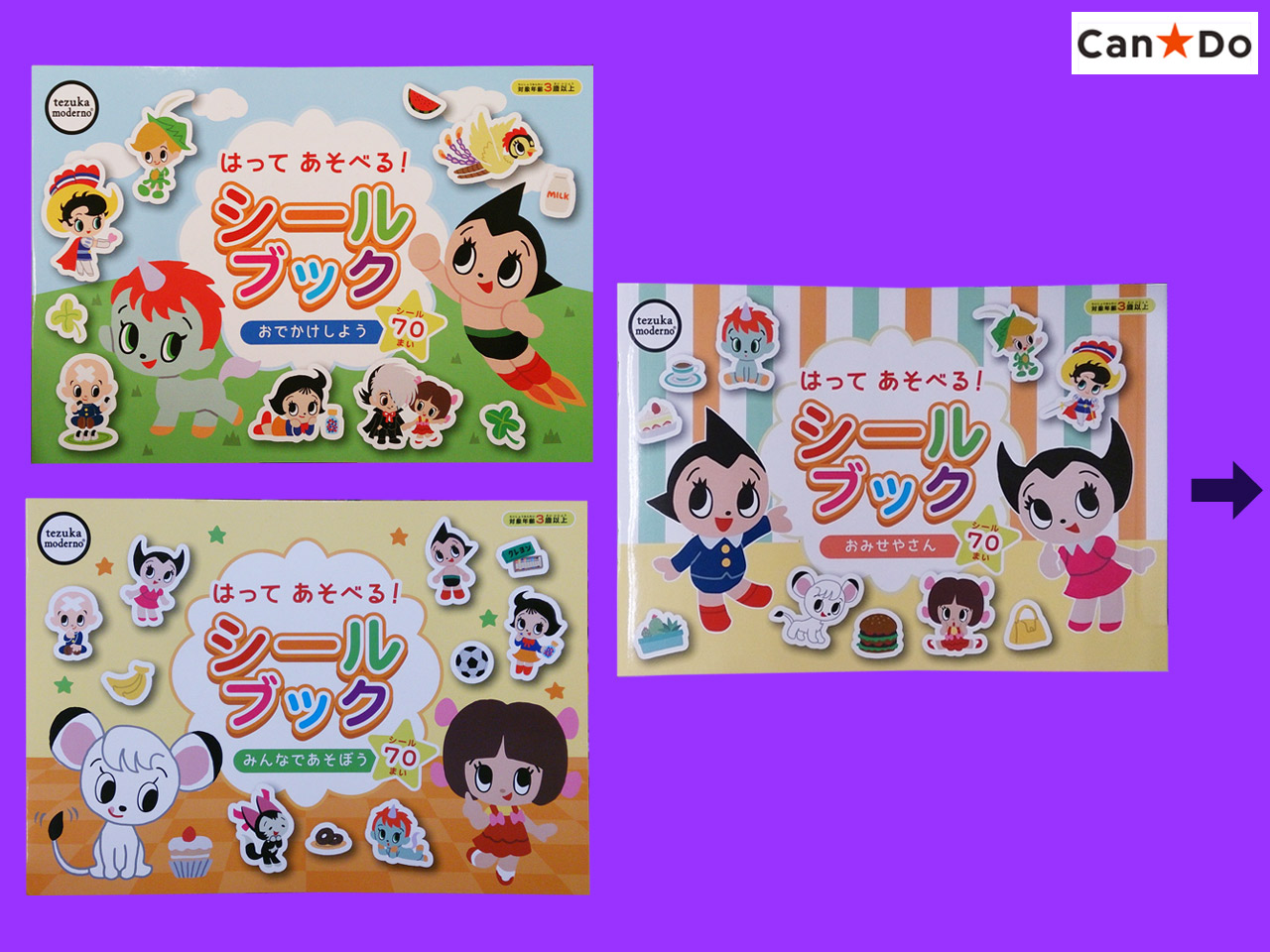 キャンドゥ(2021.4〜) 手塚プロダクションとキャンドゥのコラボ商品、手塚キャラクターの幼児用シールブック、3種(※店舗によって扱っていない種類がある)。 ①みんなであそぼう ②おでかけしよう ③おみせやさん それぞれ70枚のシール、 (中国製)