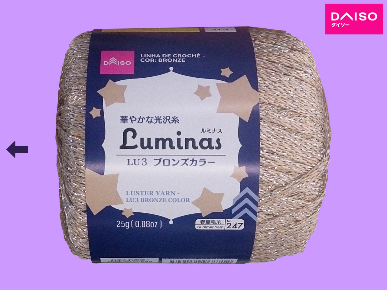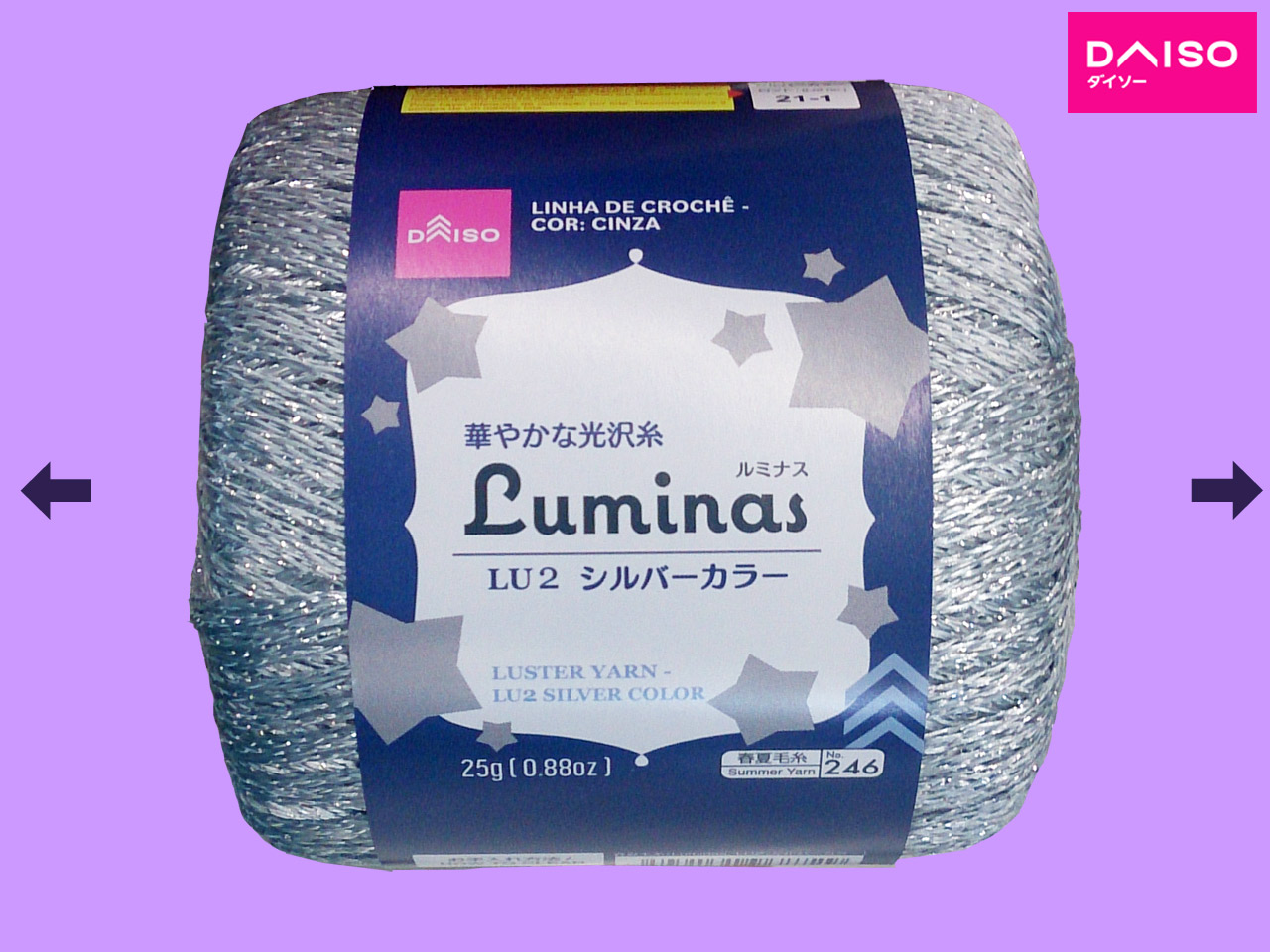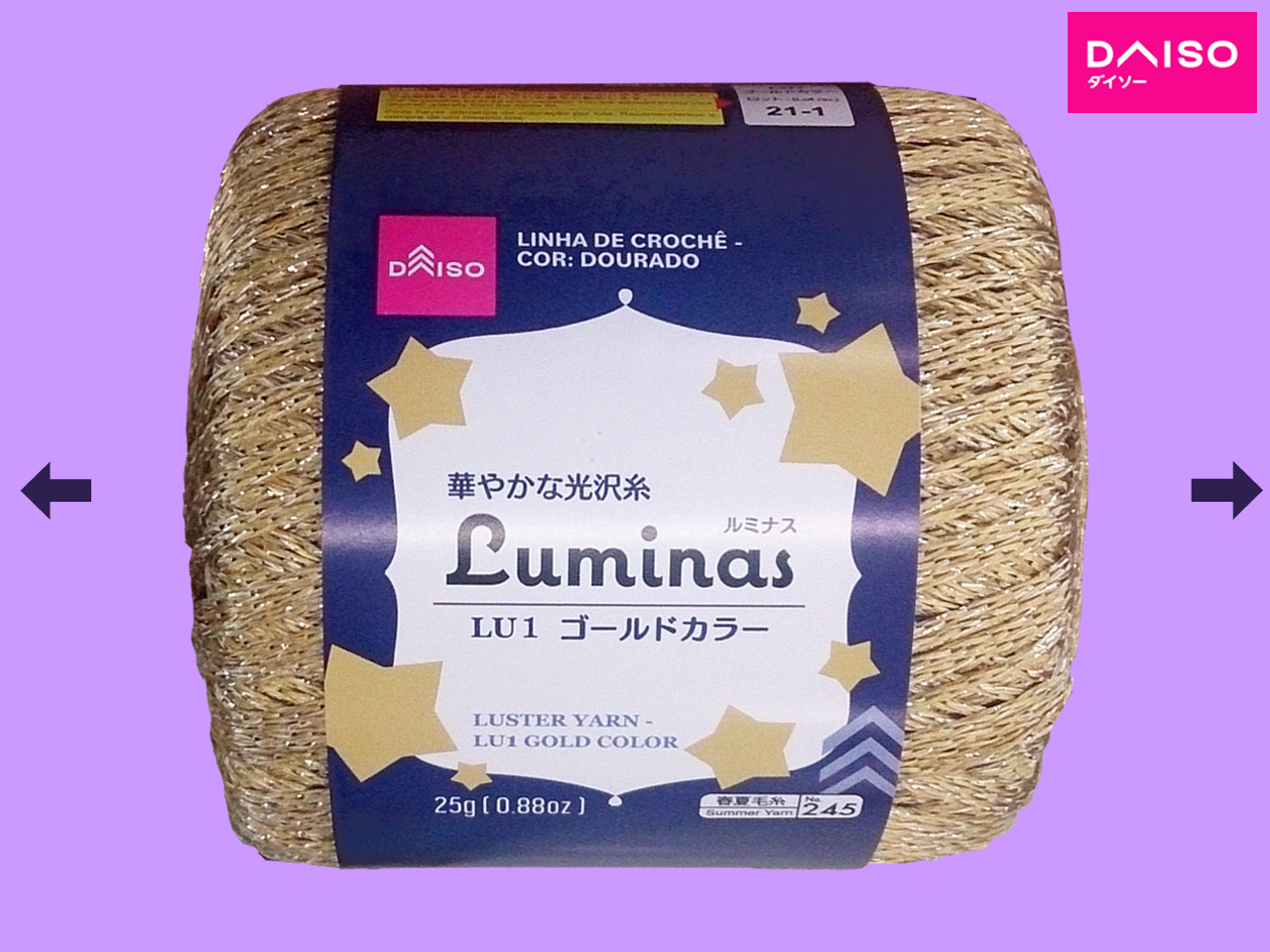 ダイソー(2021〜) 豪華絢爛ラメ入りのヤーン。秋冬物。 25g(93m) LU1 ゴールドカラー LU2 シルバーカラー LU3 ブロンズカラー 材質: ポリエステル100% かぎ針: 3.0㎜-4.0㎜ 標準ゲージ: 25目・34段 (10㎝平方メリヤス編み) おすすめ使用針: 棒針:6号 かぎ針: 6/0号