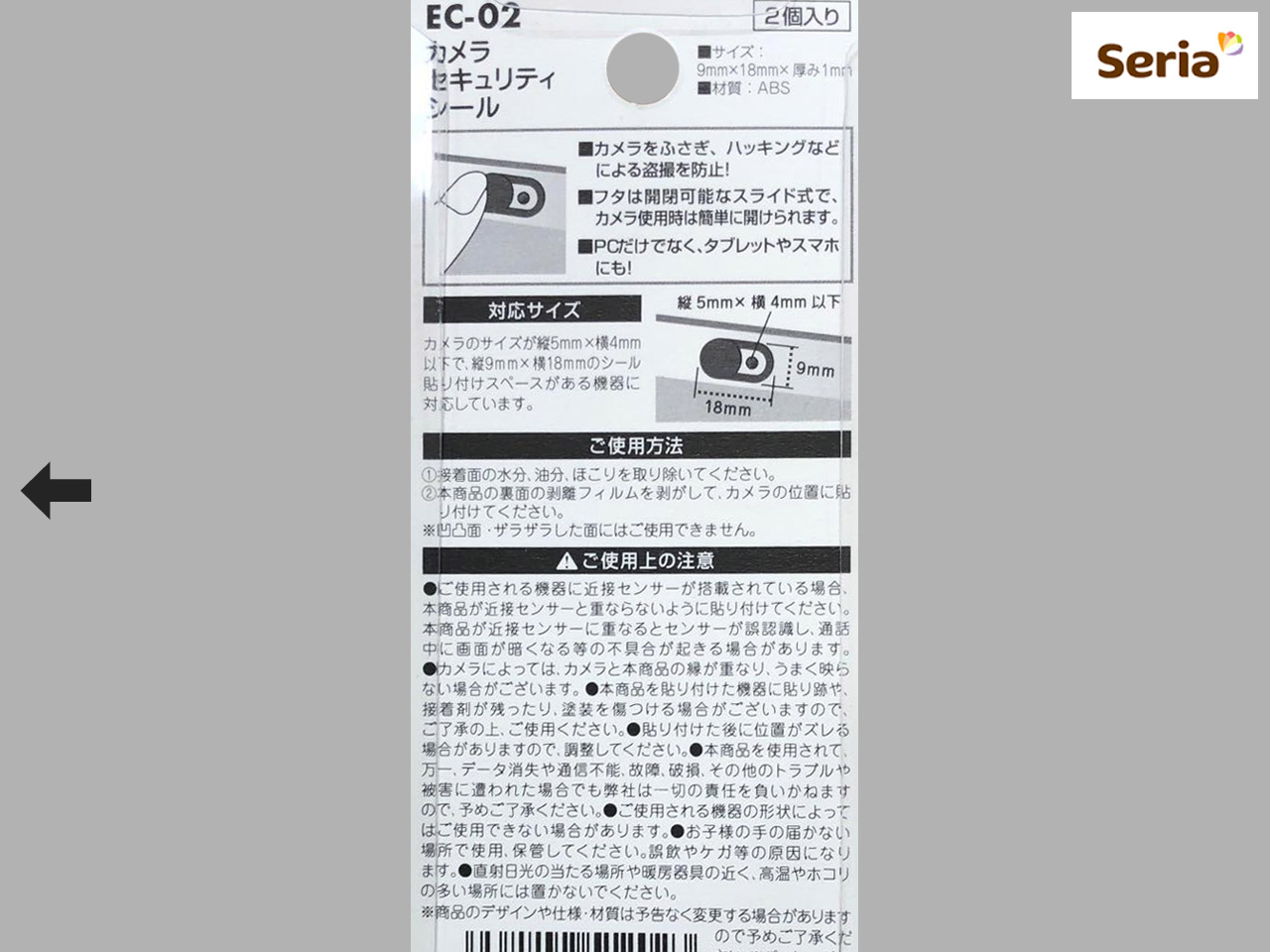 セリアほか 遠隔操作やハッキングによる盗撮を防ぐためのカメラ用シャッター。 使う時だけ開ける。 1.8cm×0.9cmまでのカメラ窓に対応。スマホ、タブレットも可。 発売元:丸七株式会社