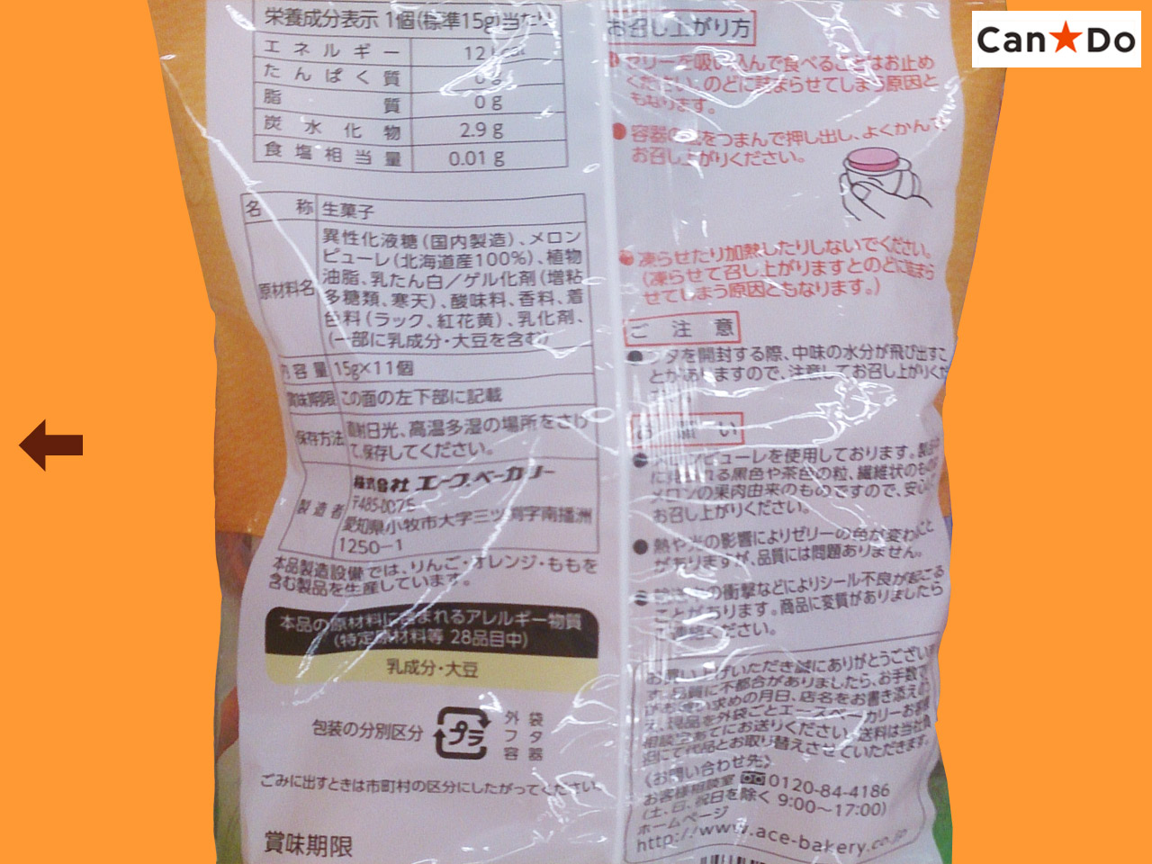 キャンドゥほか(2020〜) 北海道メロンピューレを使用したゼリー。 11個入り 発売元:(株)エースペーカリー