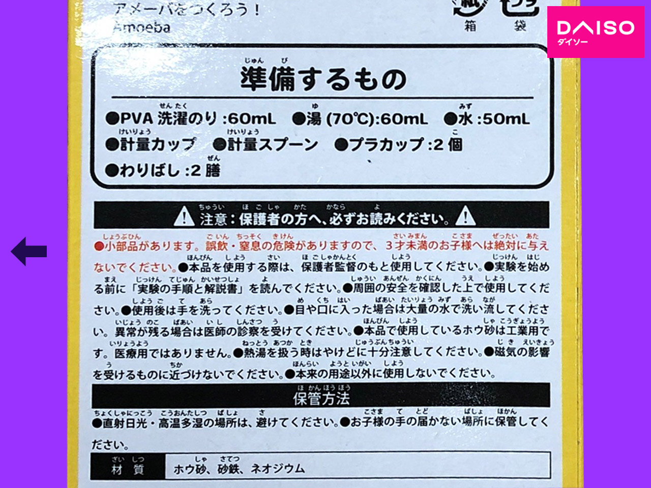 ダイソー(2021〜) 2021年から、ダイソーが発売した子供向け実験キット、『アメーバをつくろう!』 もちろん本物のアメーバではなく、砂鉄を使った磁力の実験。 (中国製)