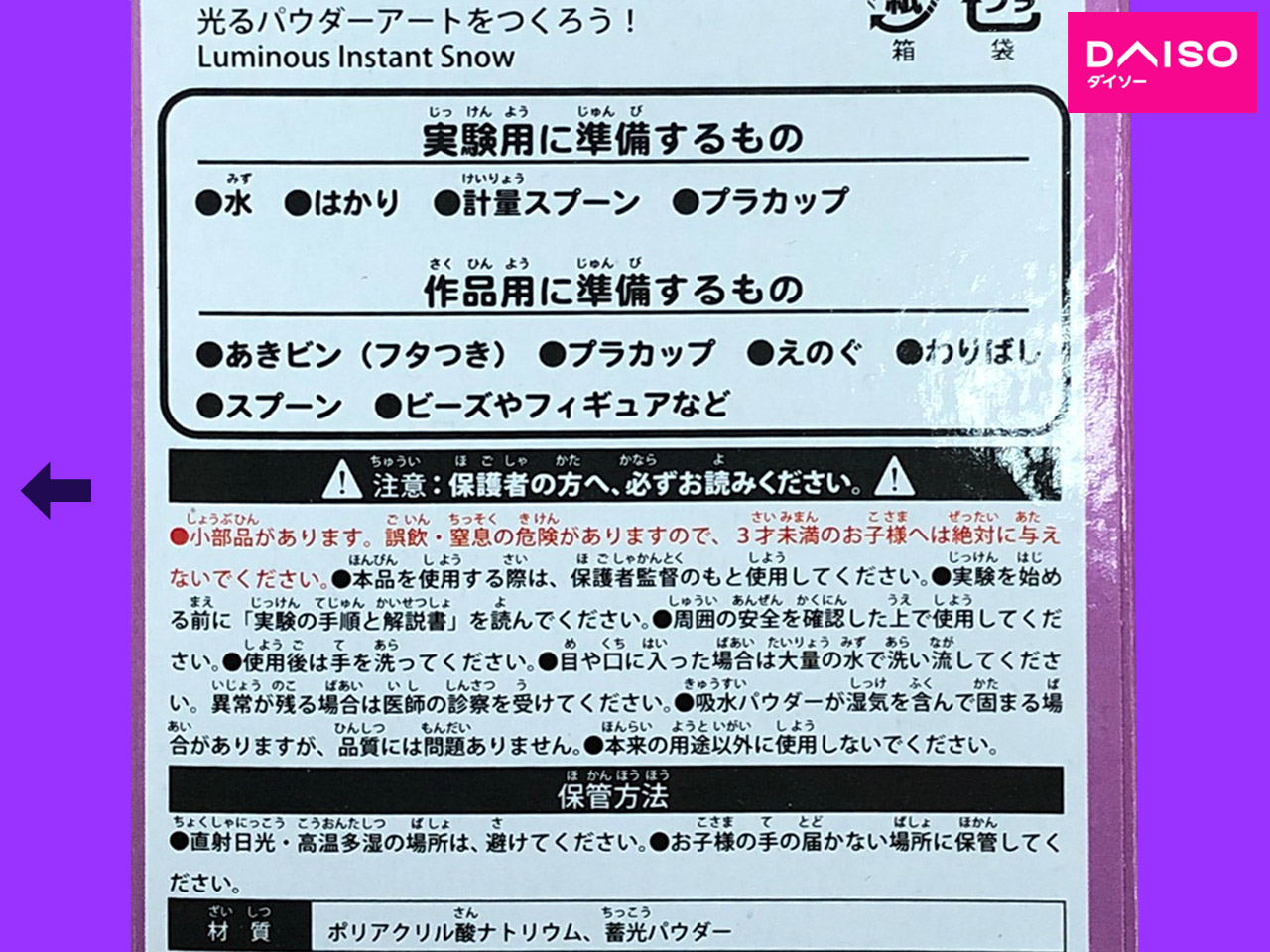 ■ダイソー(2021〜) 2021年から、ダイソーが発売した子供向け実験キット、『光るパウダーアートをつくろう!』 蓄光パウダーを使った実験。 (中国製)