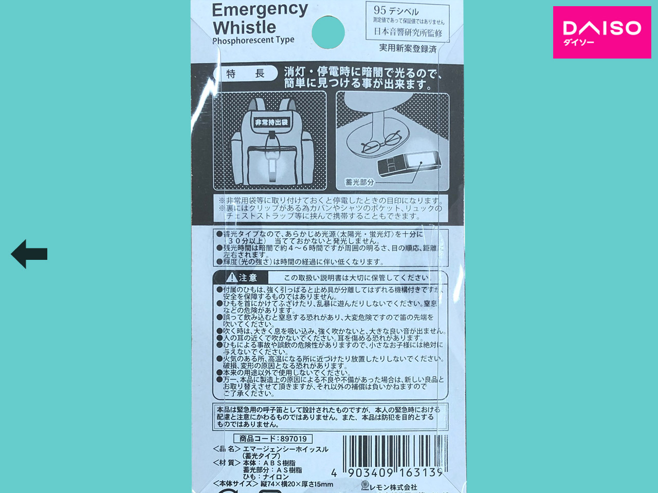 ■ダイソー(2021〜) 95デシベルの音量の非常用ホイッスル。 サイズ:7.4cm×2cm×1.5cm 発売元:レモン株式会社