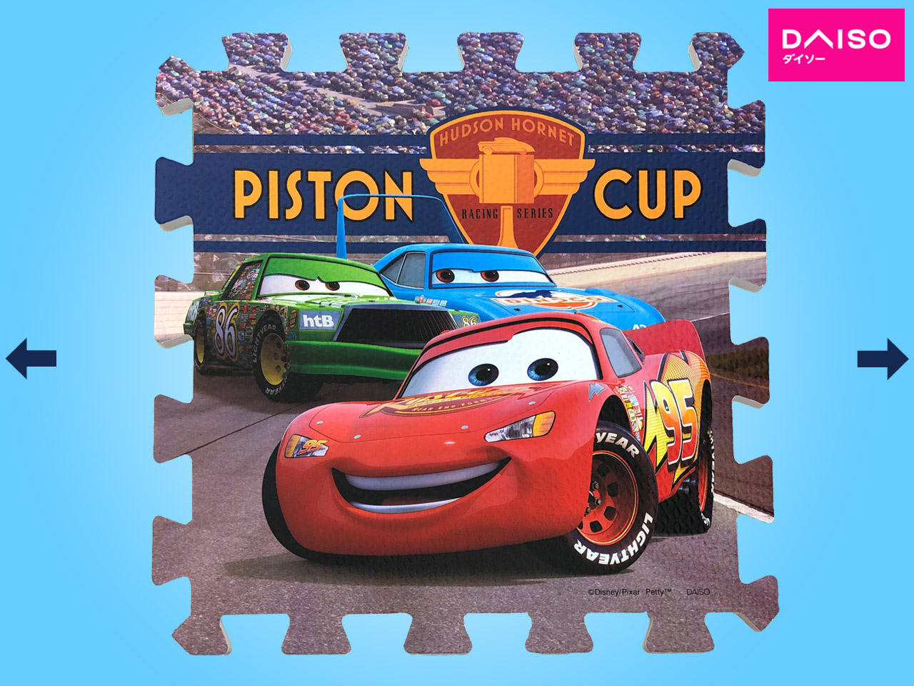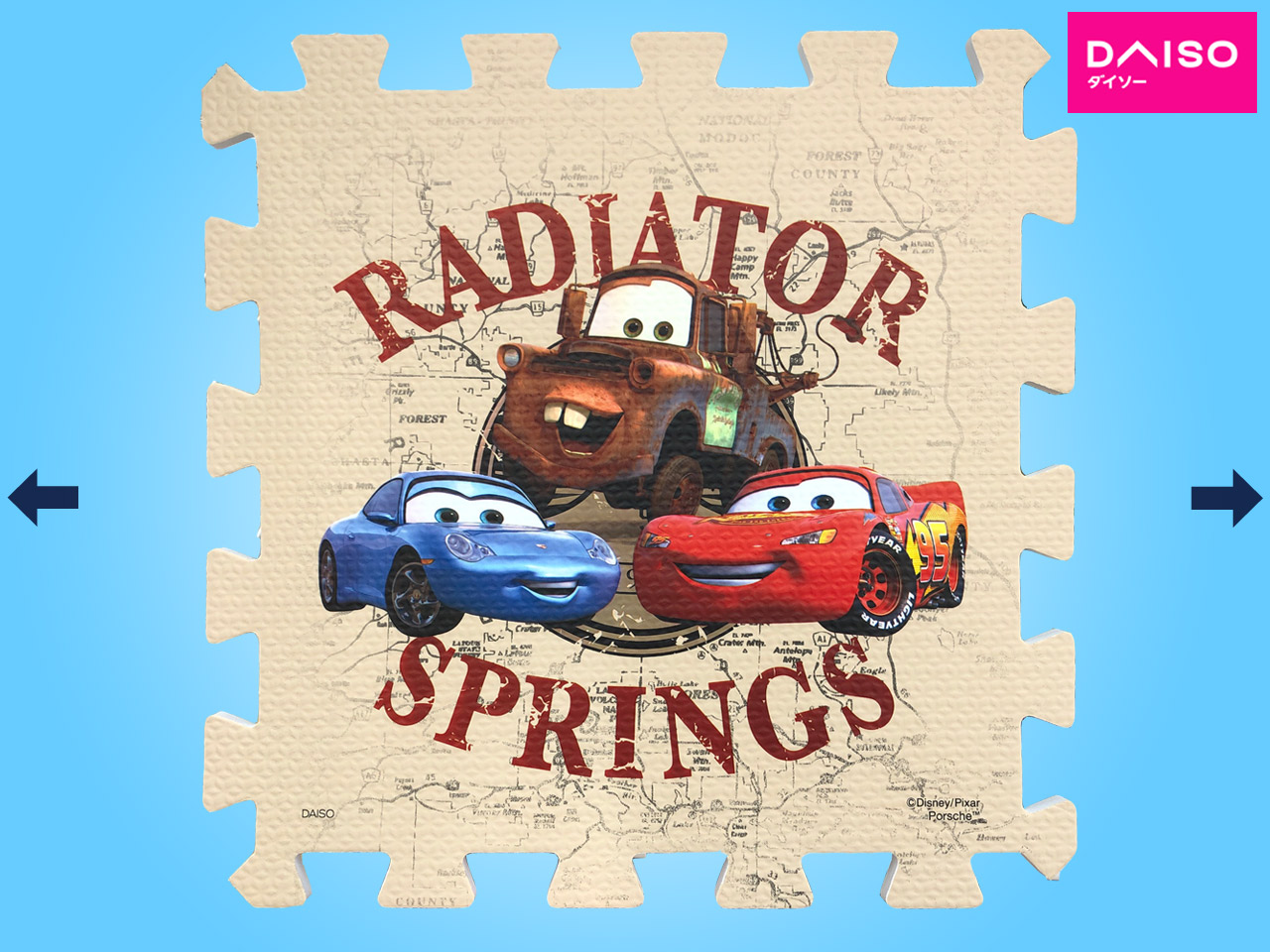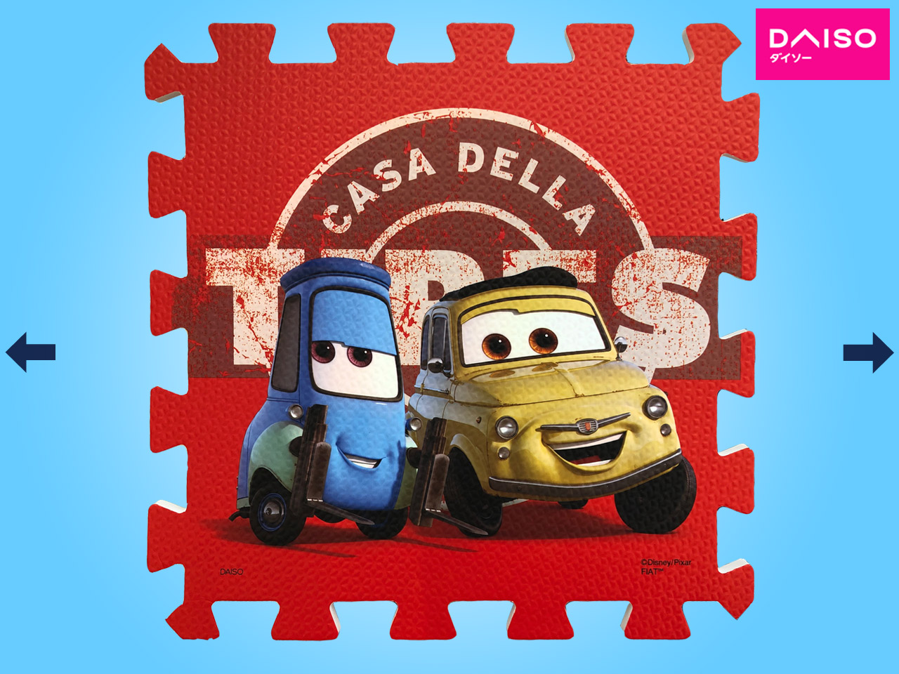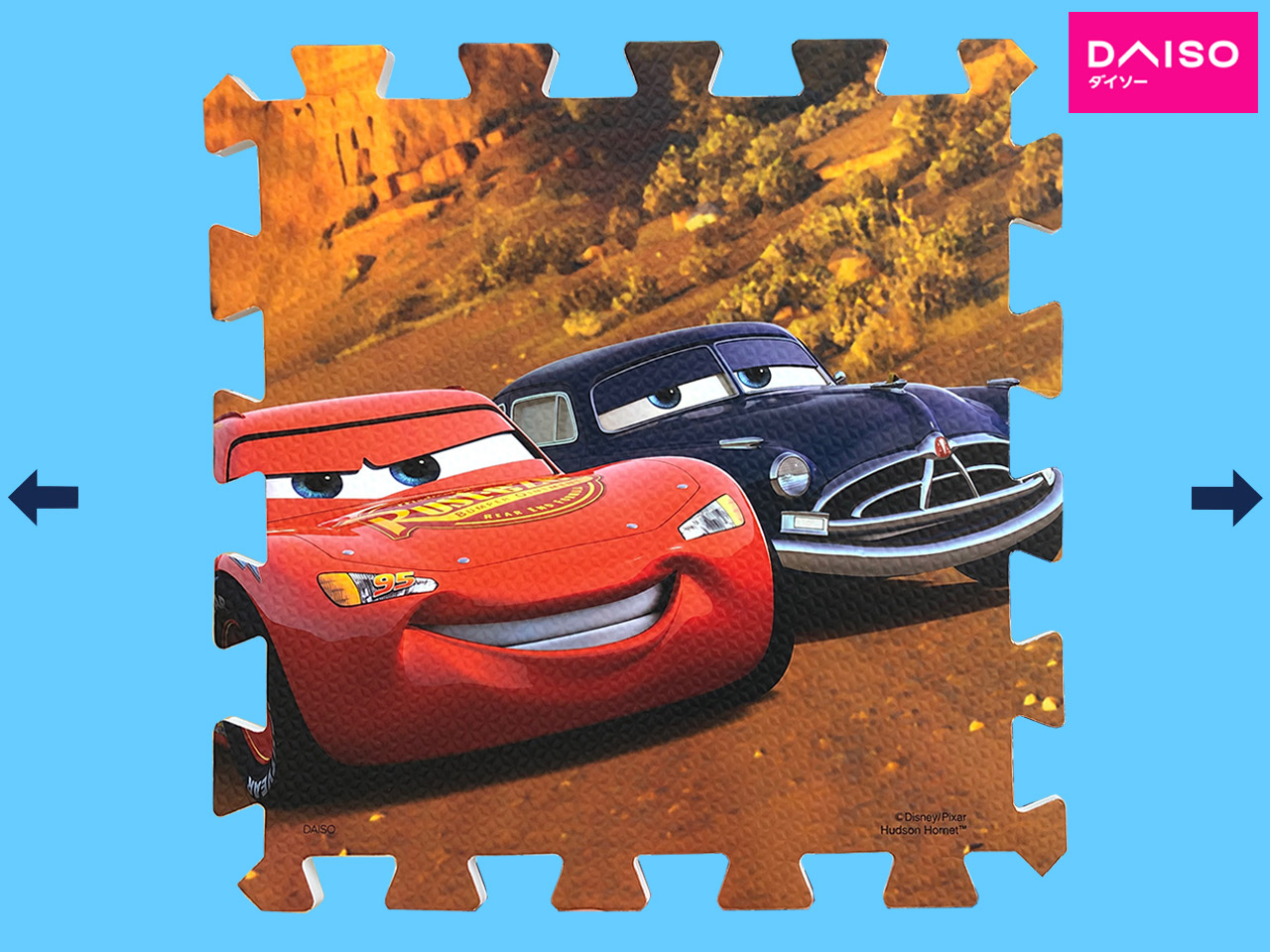 ■ダイソー(2021〜) ディズニーの組み込み式マット、Pixerの『カーズ』。 サイズ:32cm × 32cm 他に、ミッキー&フレンズ、トイストーリー、ディズニープリンセスのシリーズがある。 (中国製)