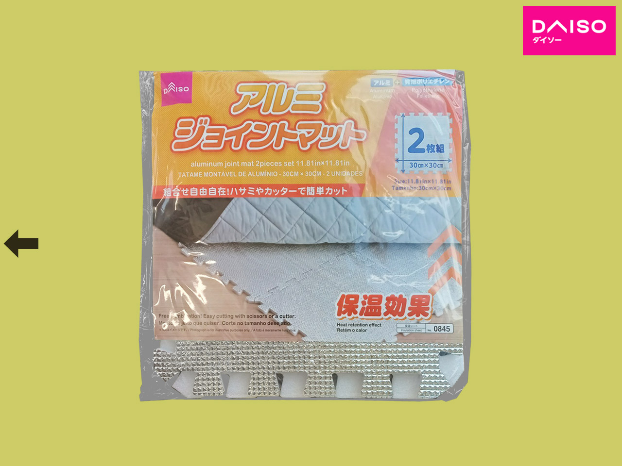 ■ダイソー 絨毯などの下に敷く断熱用のジョイント式マット。 30cm四方(2枚入り)と45cm四方(1枚入り)があり、好きなところで切断することもできる。 (中国製)