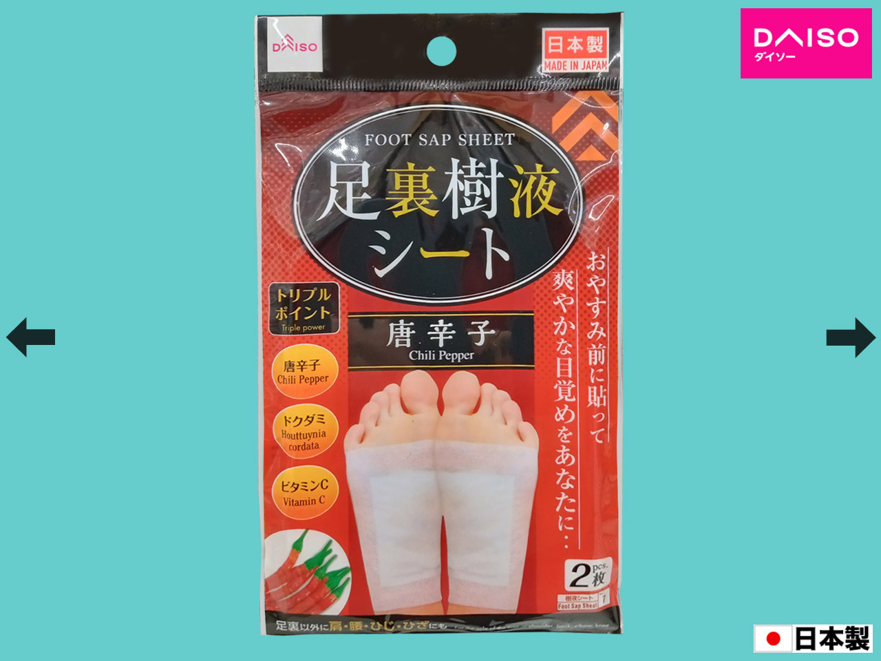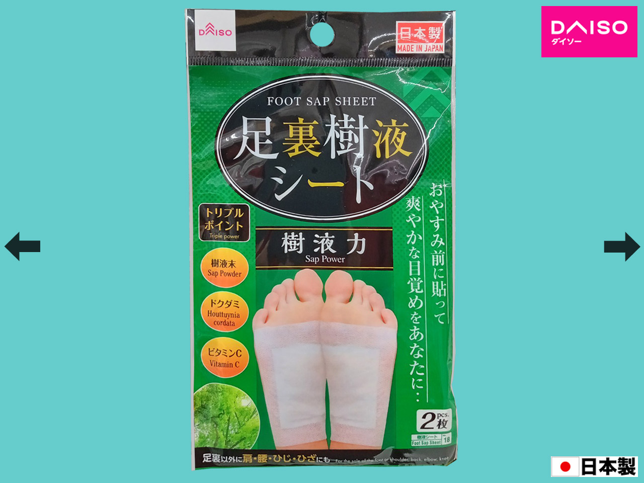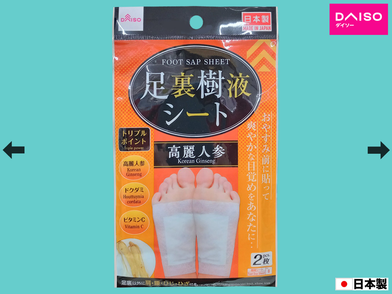 ダイソー(2021〜) 睡眠改善用、足の裏に貼る湿布、5種類。それぞれ2枚入り。 ①ヨモギ ②高麗人参 ③唐辛子 ④樹液力 ⑤ゲルマニウム それぞれに効能が異なる。 シートサイズ:6.5cm×8cm (日本製)