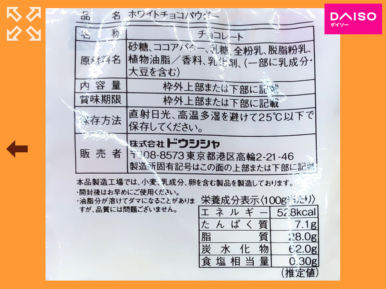 ダイソーの製菓シリーズから。ホワイトチョコレートパウダー。