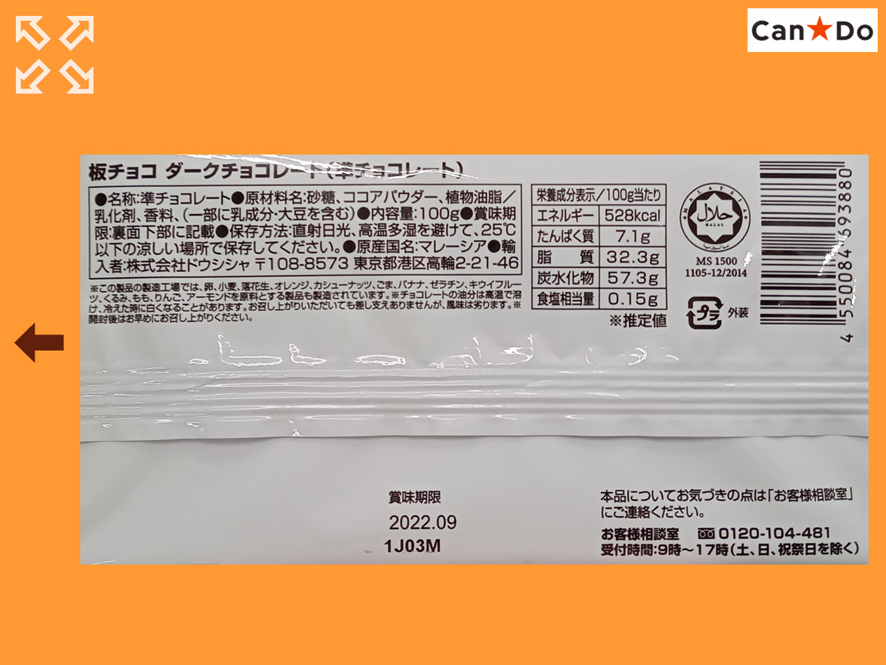 ■キャンドゥ(2020〜) ダイソーで販売されている物と同じマレーシア製のチョコレートで、同じ(株)ドウシシャから発売されているが、パッケージが若干異なる。 内容量も同じ100gで、標準的な板チョコより大きい。