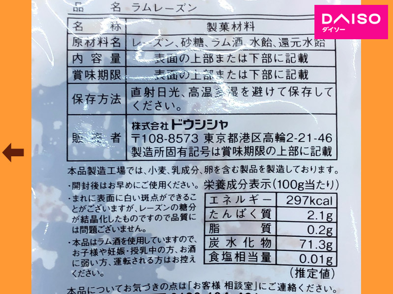 ダイソー(2020〜) ダイソーが展開している製菓用の材料。ラム酒ににつけたレーズン。 内容量:30g 発売元:株式会社ドウシシャ