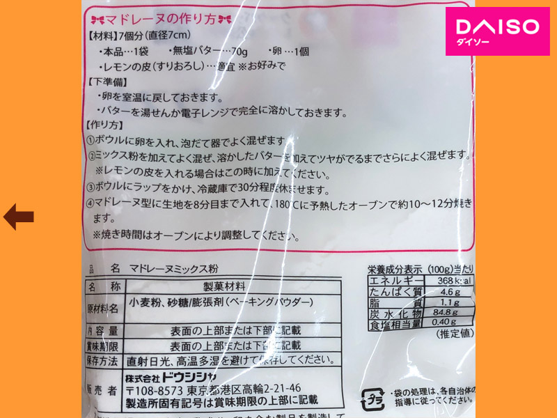 ダイソー(2020〜) ダイソーがシリーズ展開しているケーキミックス粉。 2020年からパッケージが全面的に変更された。 内容量:120g 発売元:株式会社ドウシシャ