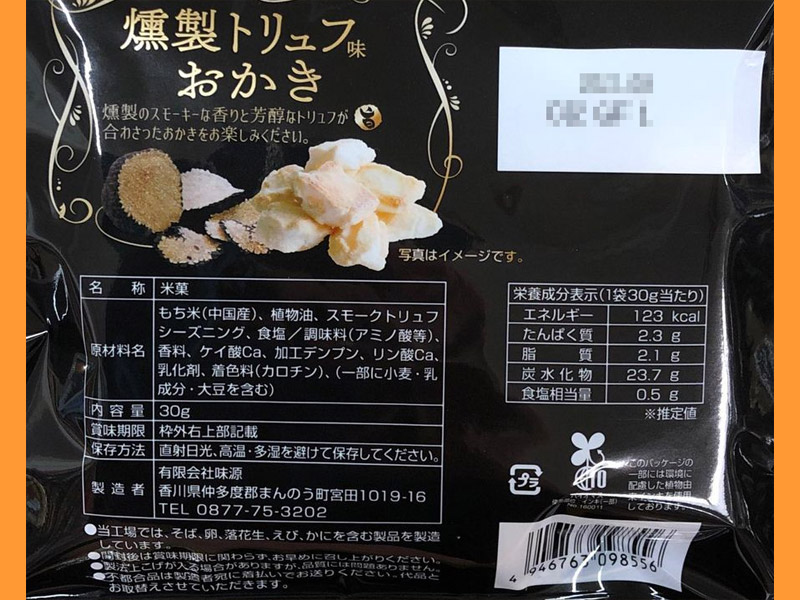 このおかきは、トリュフシーズニングという調味料が使用されているが、その中のトリュフ分が、どこの生産なのかまでは分からない。