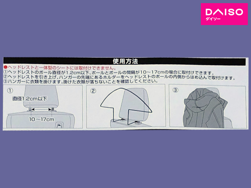 ダイソー(2022〜) 車のヘッドレストに装着するハンガー。 サイズ:44.3cm×23.5cm 最大荷重1kg 発売元:関根金属株式会社 (中国製)