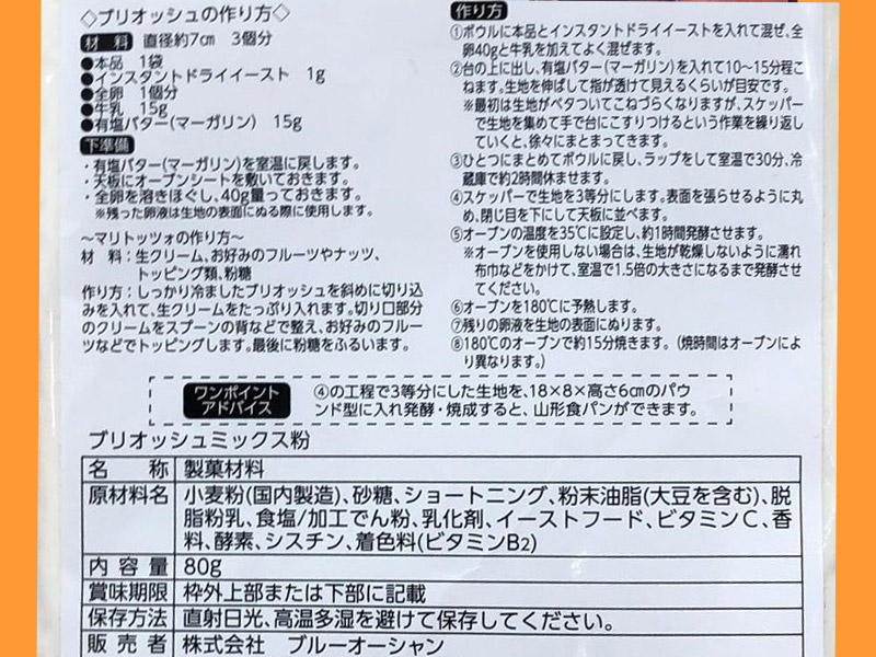 セリア(2022〜) フランス発のパン、ブリオッシュが作れるミックス粉。 内容量:80g(直径7cmのブリオッシュが3個作れる) 発売元:株式会社ブルーオーシャン
