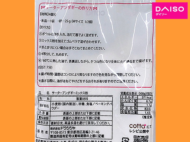 本品に卵25グラム(Mサイズ 1/2個)をいれ混ぜ合わせて160℃に熱した油で揚げる。