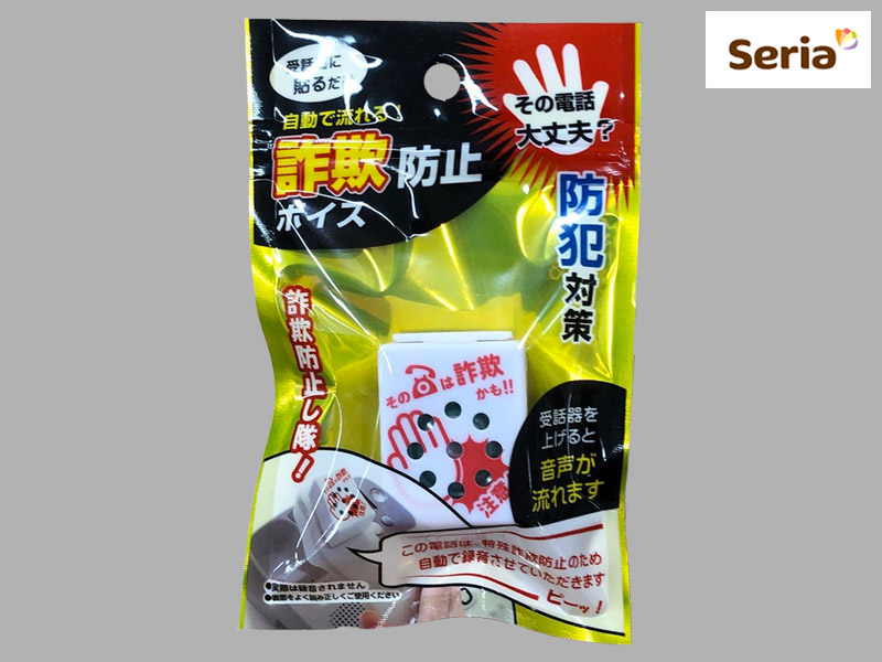 セリアほか 受話器にくっつけて使用する特殊詐欺防止用ボイス。 「この電話は特殊詐欺防止のため、自動で録音させて頂きます」というダミーの案内が流れる。 電池:CR-2032×1個 サイズ:4cm×3.3cm×1.8cm 発売元:丸七株式会社 (中国製)