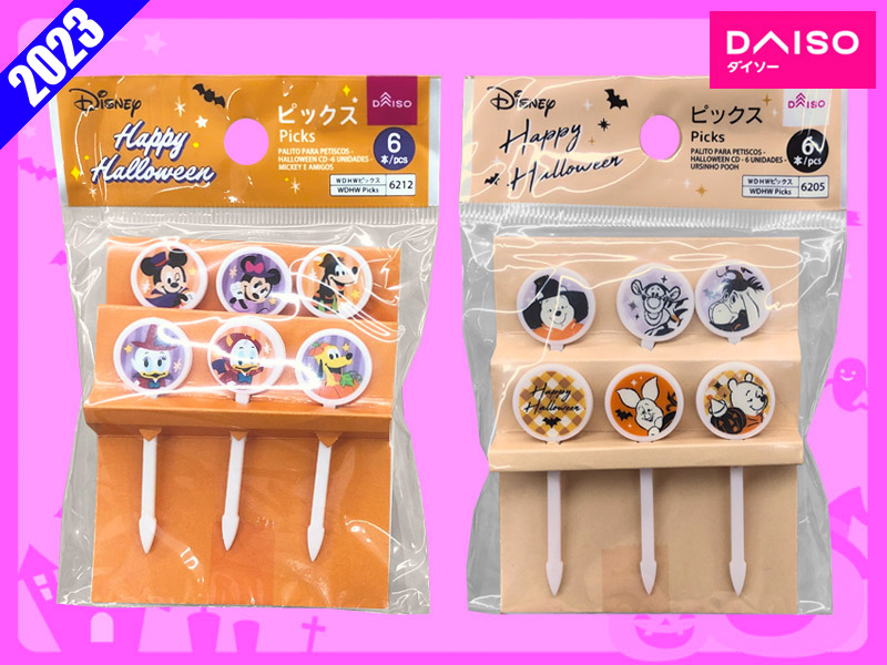 ダイソー(2023) ディズニーのピック6本入り2種類。 長さは5.5cm ①ミッキー&フレンズ ②くまのプーさん (中国製)
