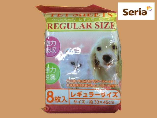 ■セリア(2015〜) 脱臭効果のあるペットシーツ。レギュラーサイズ8枚入り 33cm × 45cm ホームセンターで売られている物が、80枚入りで1400円くらいなので、価格としては割安〜標準的。