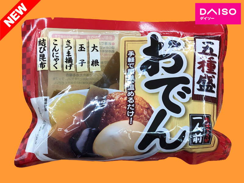 ダイソー(2015) 大根、玉子、さつま揚げ、こんにゃく、結び昆布の5種類の入った小さめの「おでん」。 再加熱でそのまま食べられる。 内容量:280g(うち固形物110g) 発売元:ネクストレード株式会社 (タイ製)
