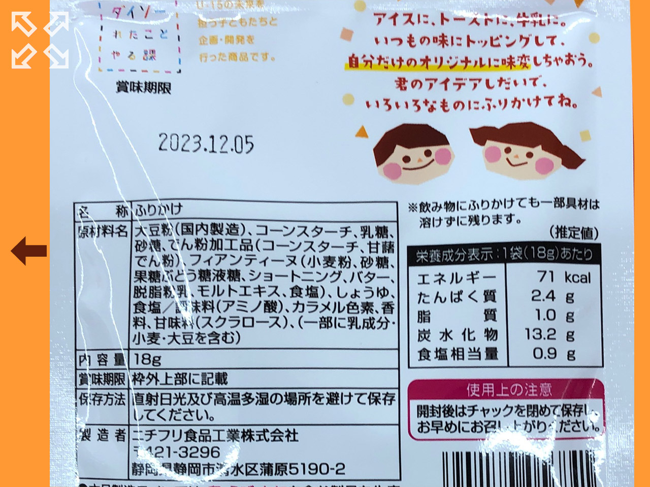 2023年、ダイソー50周年記念イベントとして、15歳以下の子どもたち発想を商品化する「ダイソーれたことやる課」を設立(?)50種以上の商品がが開発発売されたが、これもそのひとつ、”甘いふりかけ”。