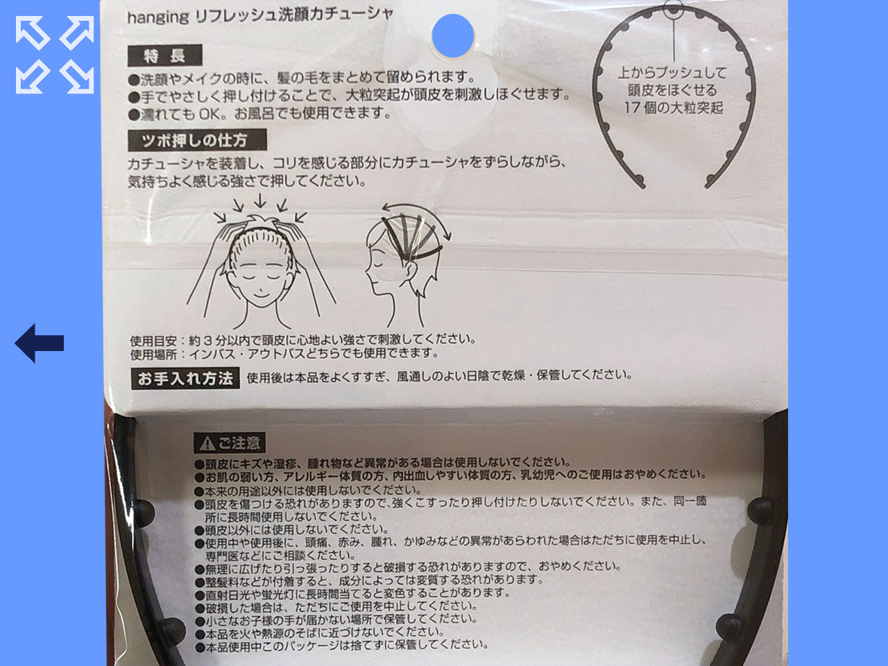 洗顔時やパック時の使用のほか、頭皮のマッサージもできるカチューシャ。