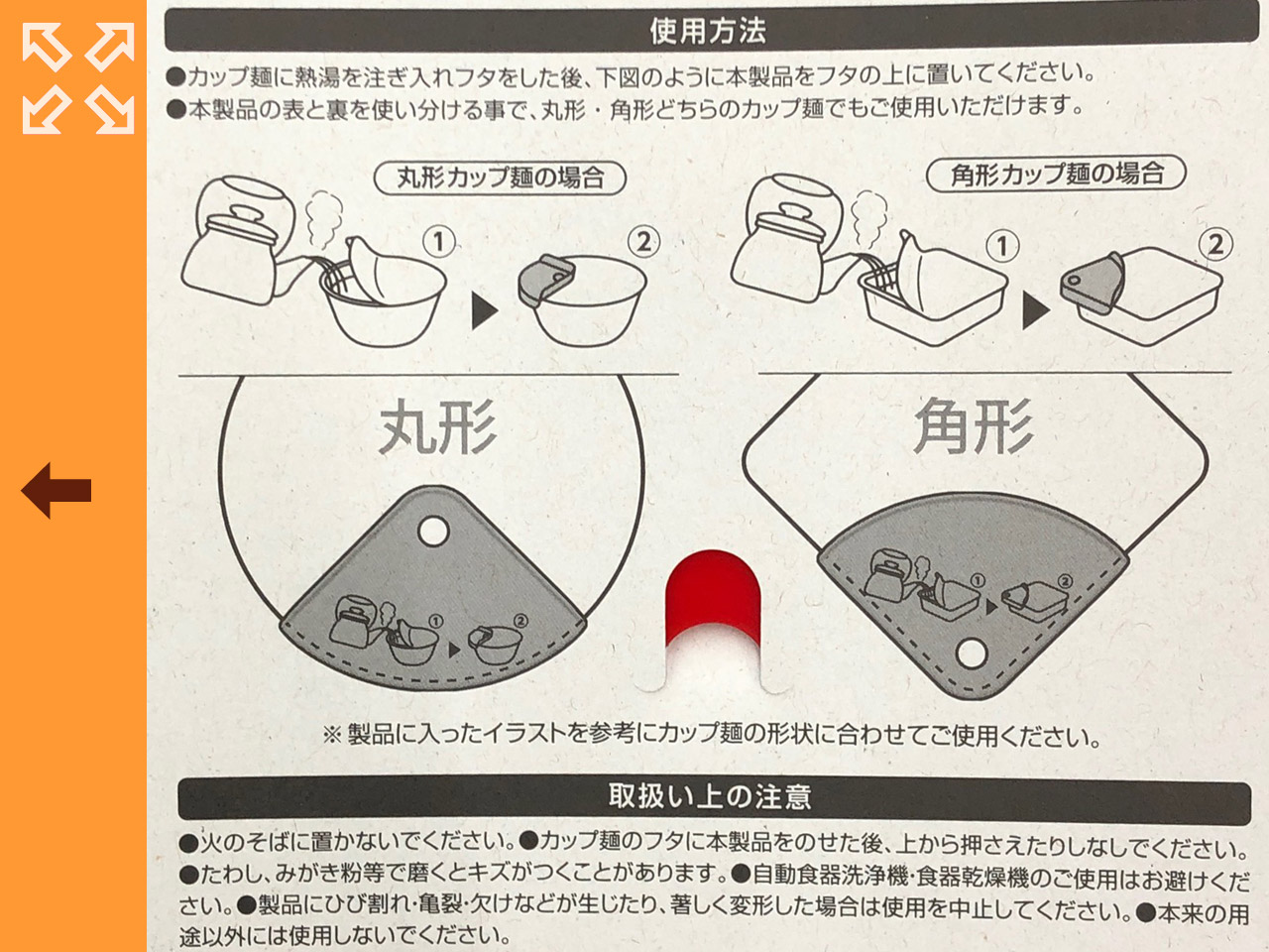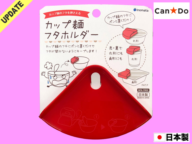 キャンドゥほか(2023〜) カップ麺の蓋にのせるホルダー。 裏と面で、ヤキソバ系の四角いフタにも対応している。 サイズ:13.2cm×8.8cm×3.6cm 発売元:イノマタ化学株式会社 (日本製)