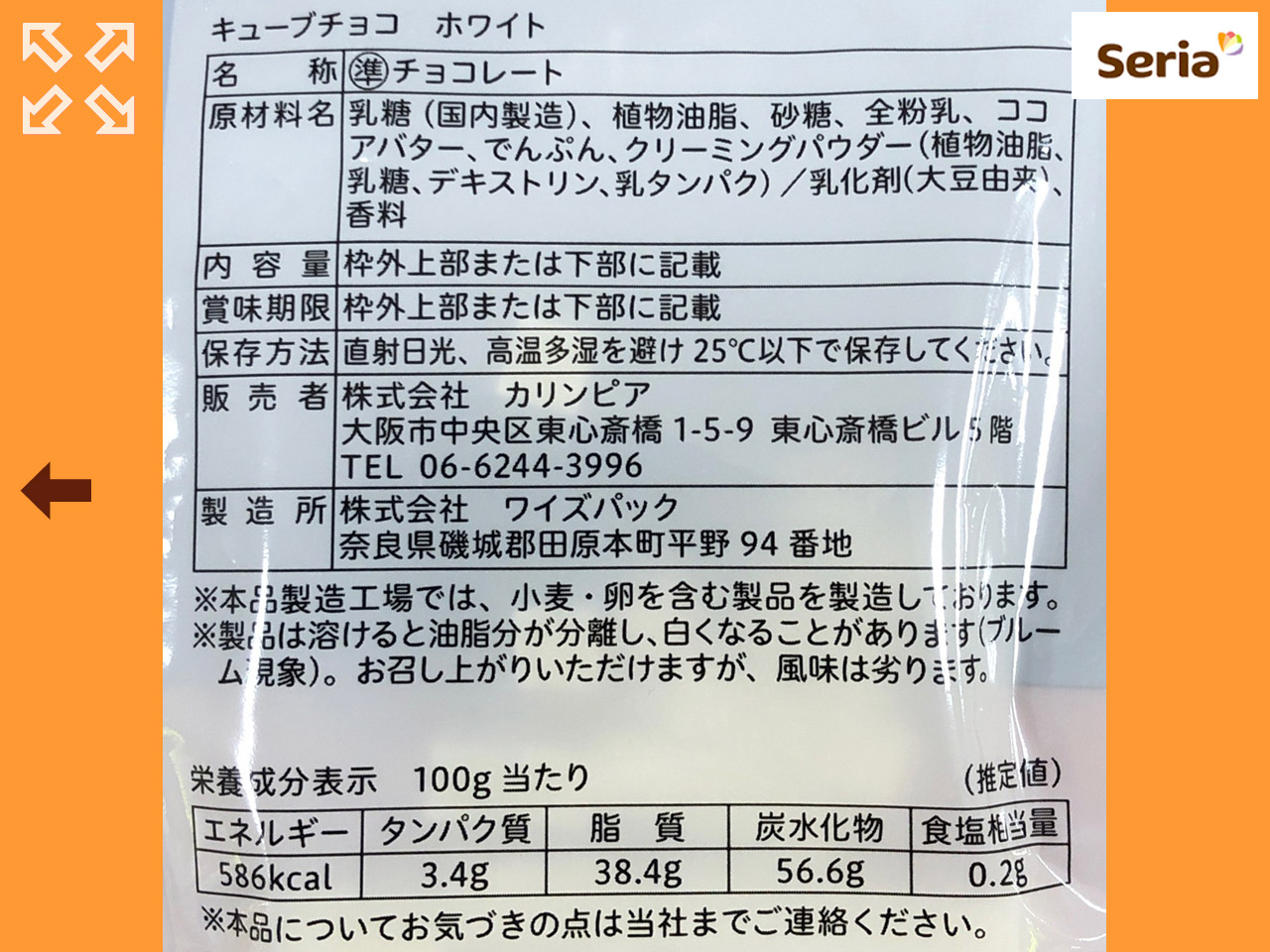 セリア セリアの展開する製菓材料。 ミルクとバニラ風味のホワイトチョコレート(準チョコレート)をキューブ状にしたもの。 パンなどに混ぜたり、トッピングにも。 内容量:18g(2023年12月現在) 製造元:株式会社ワイズ (日本製)