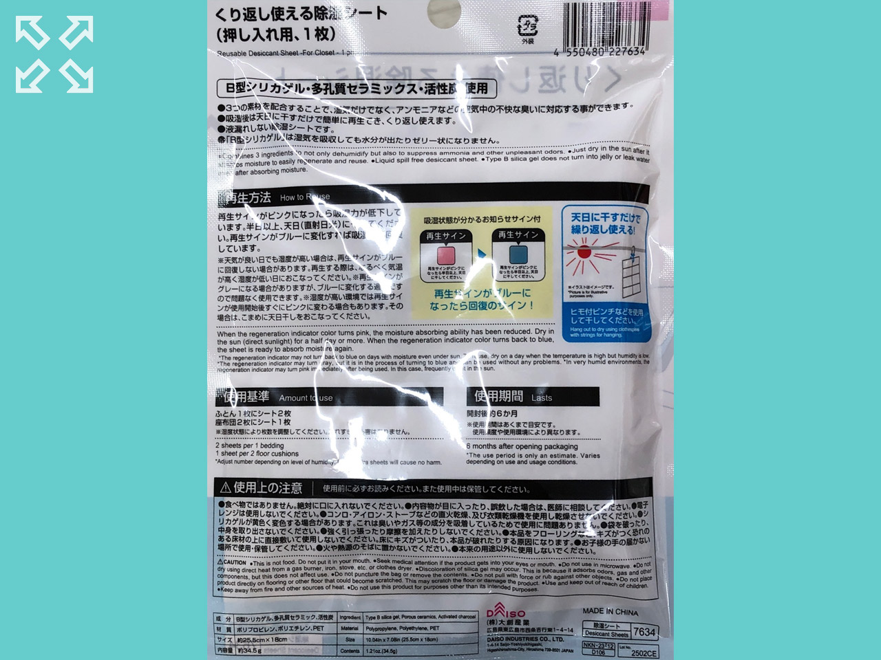 シリカゲル利用の除湿シート。除湿後、日干しで再生する。再生サイン付き。