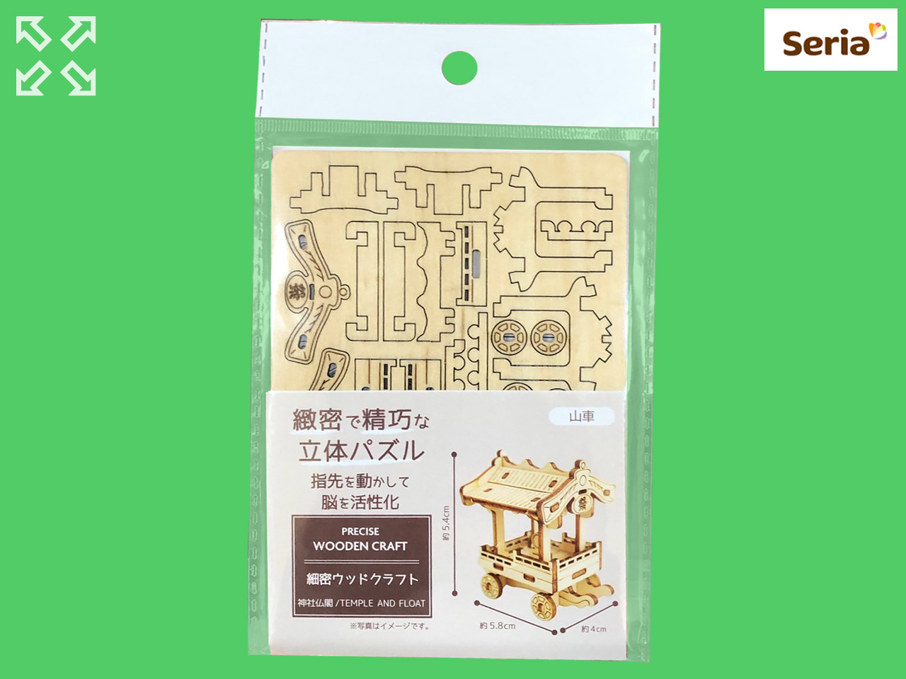 セリア 組み立て式のウッドクラフト、神社仏閣のシリーズから、山車(だし)。 サイズ:5.8cm×4cm×高さ5.4cm 発売元:株式会社カリンピア (中国製)
