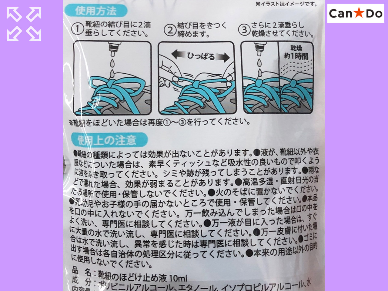 キャンドゥ(2023〜) ほどけやすい靴紐をほどけにくくする固定液。 容 量:10ml 発売元:大榮工業株式会社 (日本製)