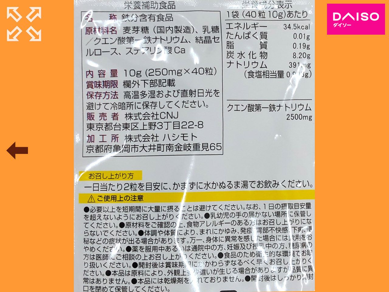 ダイソー栄養補助食品から、特に女性に必要と言われる「鉄」分。