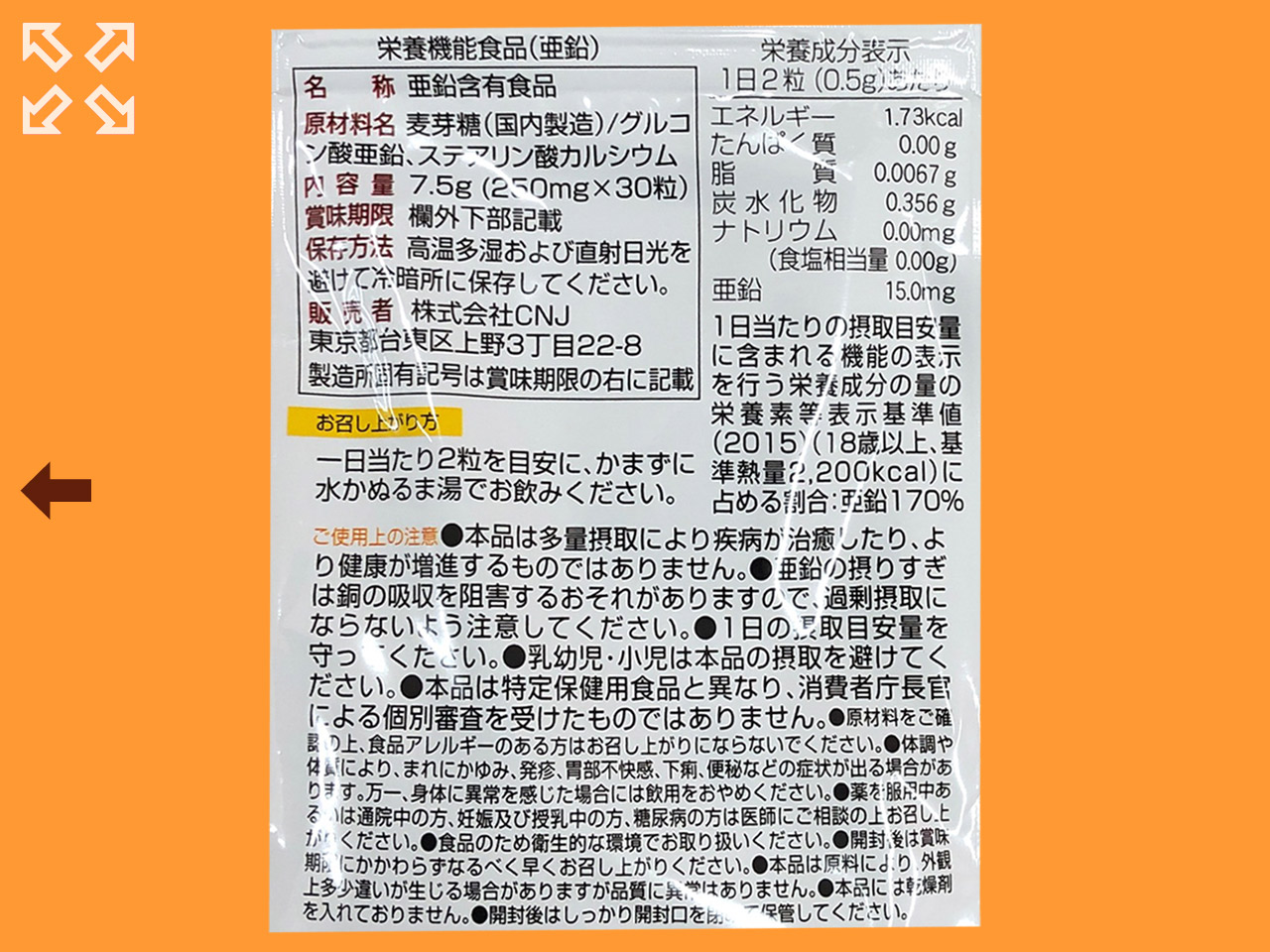 ダイソーには、主に2種類の発売元によるサプリメントがあるが、こちらは株式会社CNJのもの。