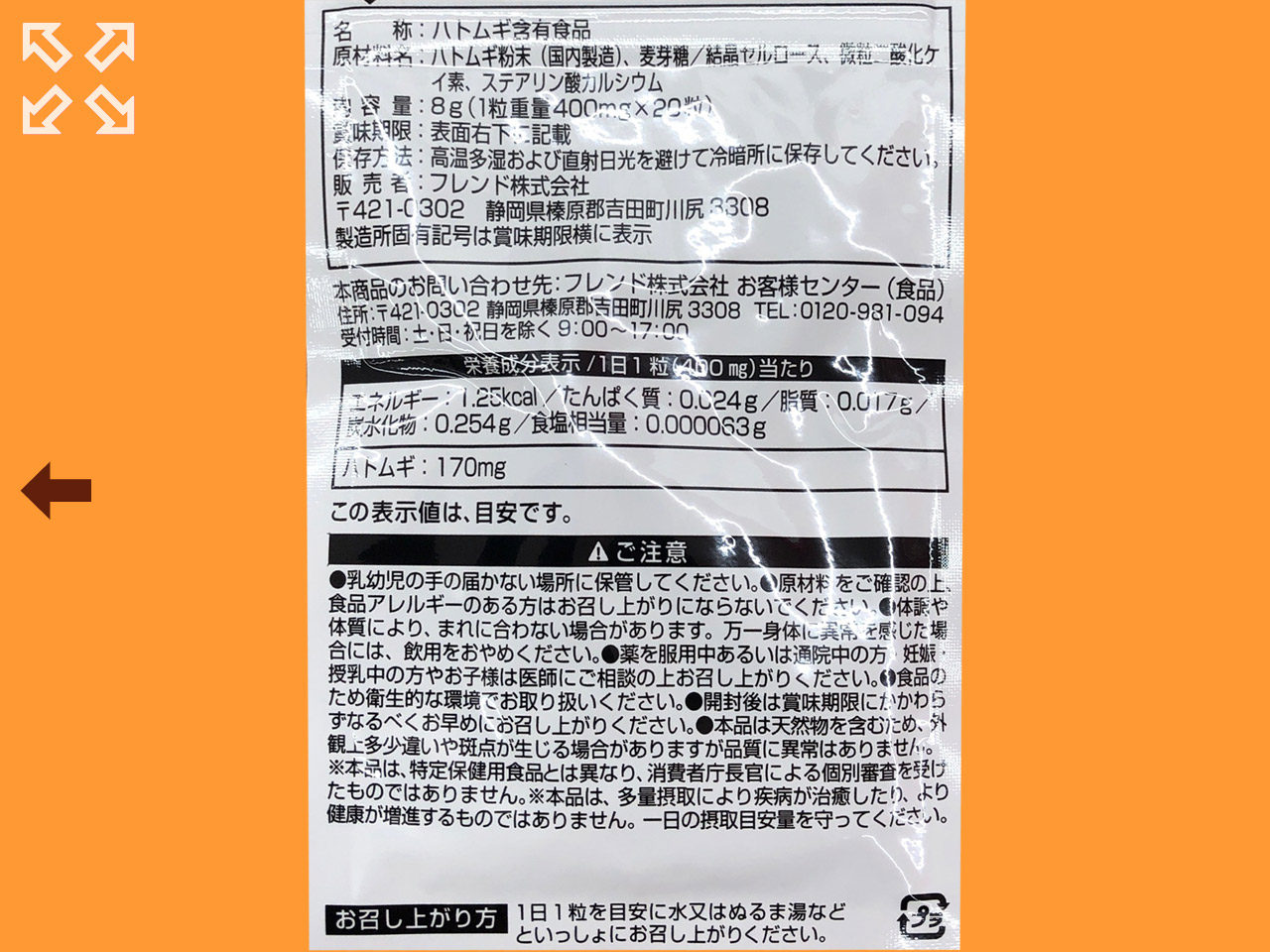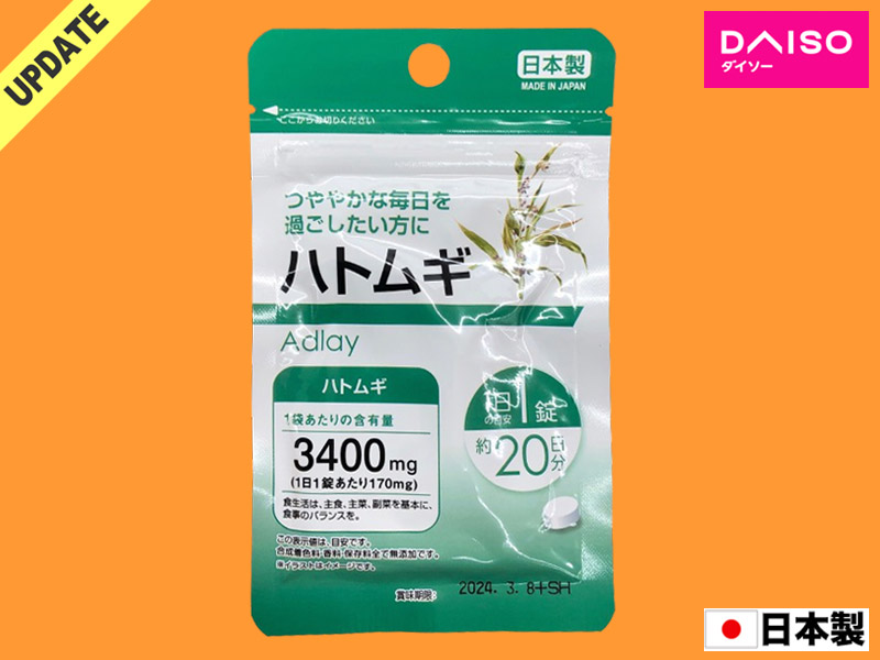 ダイソーのサプリメントシリーズから、乳液などでも有名なハトムギの含有食品。