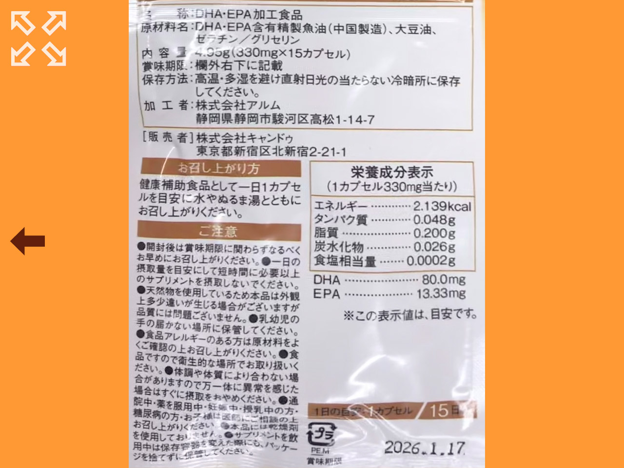 キャンドゥが取り扱っているサプリメントから、脳に良いとされるDHA+EPA。