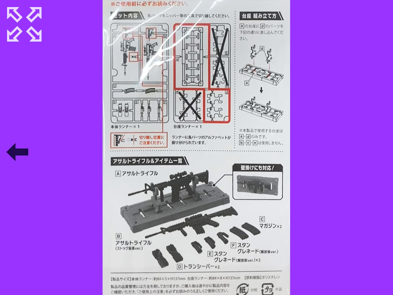 ガン本体、マガジン、スタングレネード、トランシーバー、台座付き。