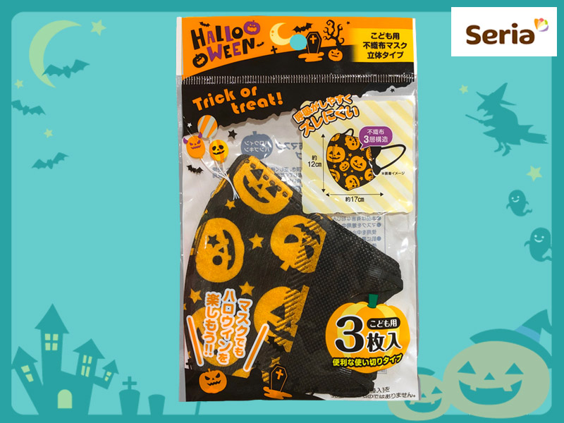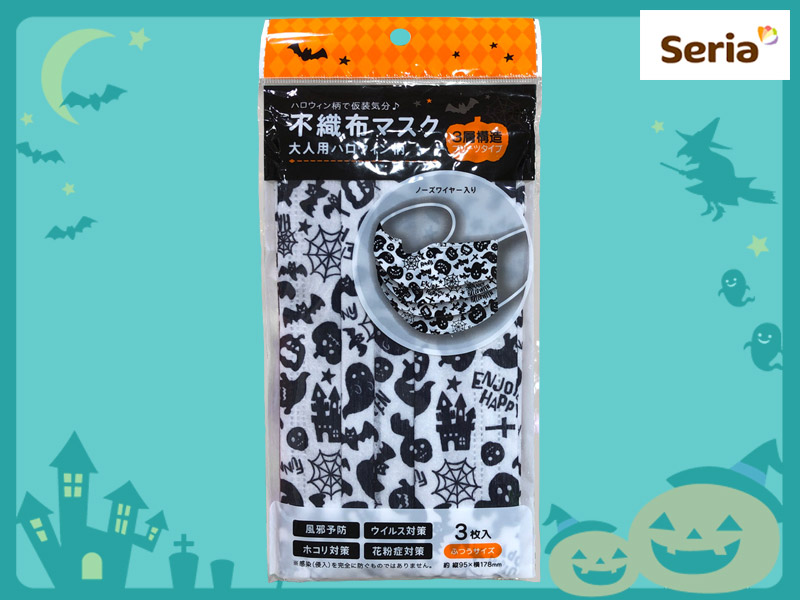 セリア(2025〜) 猫の仮装用マスク、白猫と黒猫の2種類。 仮装用なので、医療用としての効果は得られない。 サイズ:13cm×16cm(紐を含まない) 発売元:株式会社 日本パール加工 (中国製)