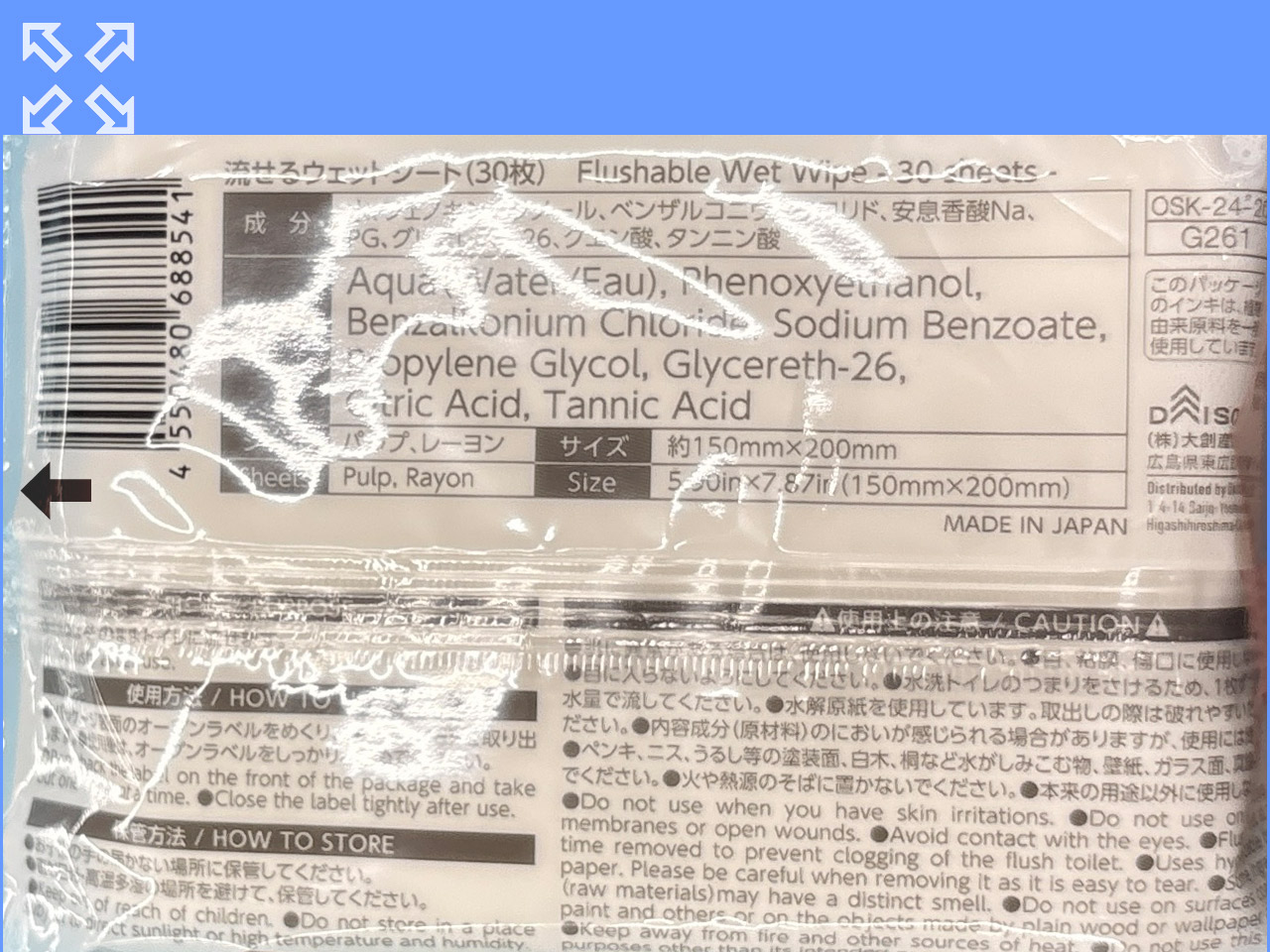 目的:トイレに流して処理できるように、使用中は強度を保ちつつ、水に触れると速やかに分解するように作られています。