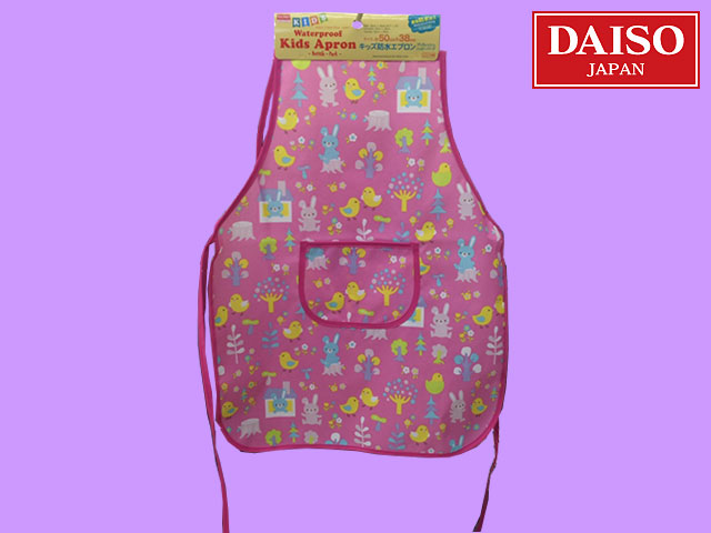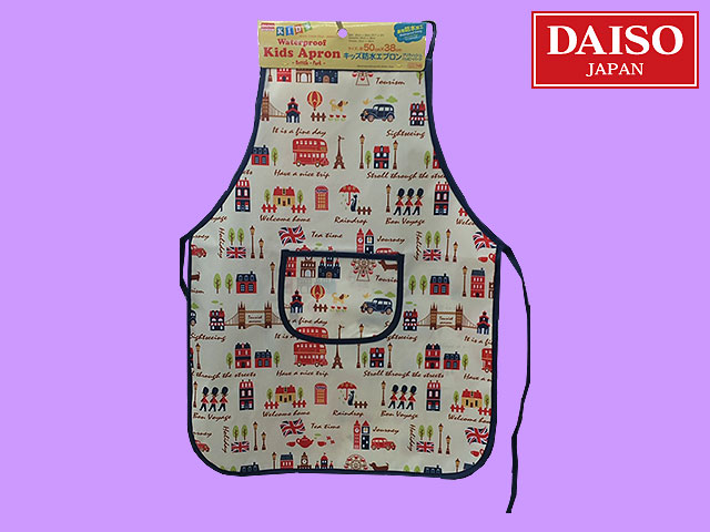 ■ダイソー(2016〜) こども用防水加工済みのエプロン。 小学校入学前に給食用として用意するならぴったり。 サイズ:50cm×38cm 柄違いのビークルーもある。